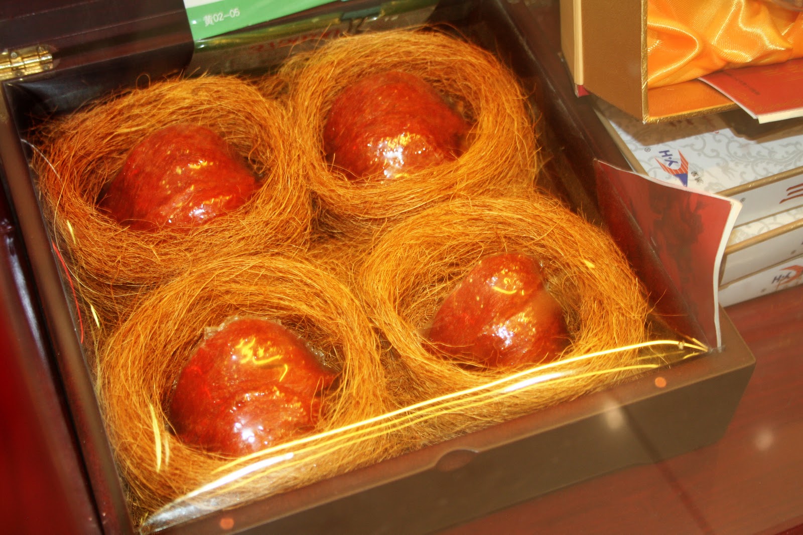 Une autre spécialité de Chine, des nids d’hirondelles qui se mangent souvent en soupe. Le nid est au milieu du faux nid de paille. Le prix pour ce genre de mets, est excessivement élevé. Il est en effet risqué d’attraper ces nids en haut de falaises… A noter également que ce ne sont pas des hirondelles, mais une sous espèce de martinet qui sécrète un mucus mucilagineux comestible.