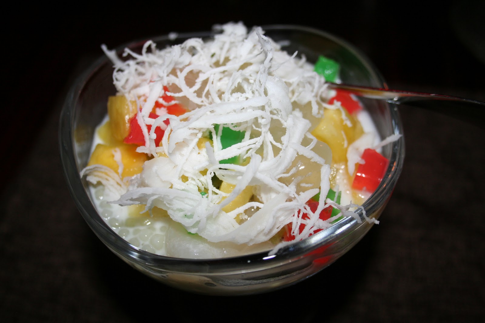 Et le restaurant m’a même offert un dessert! Je ne sais pas si c’est par pitié, car je mangeais seul, ou bien car je prenais des photos. Je leur ai précisé que c’était pour mon site et que j’allais écrire sur eux… Je ne saurai jamais! En tout cas il s’agissait de lait de coco glacé avec des fruits frais et du tapioca coloré… Rafraichissant!