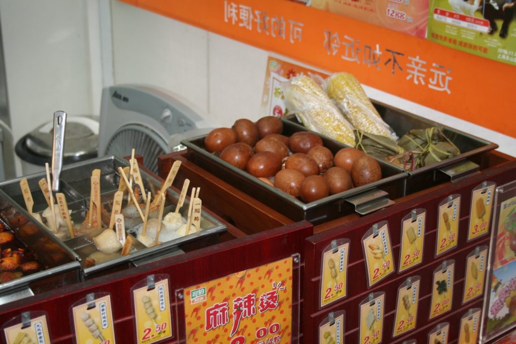 Dans les supermarchés, des petits stands d’oeufs et de brochettes de boulettes de poissons.