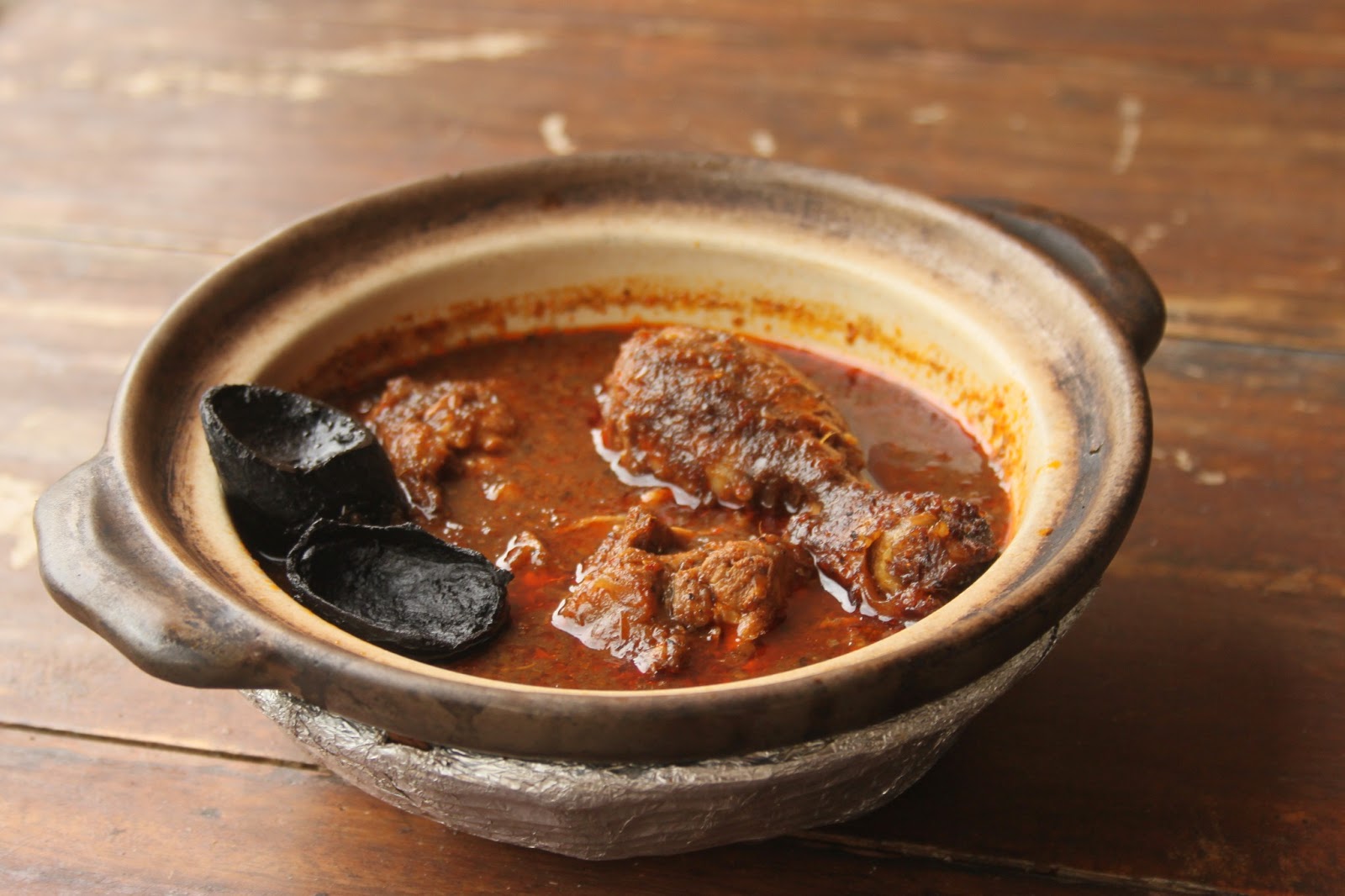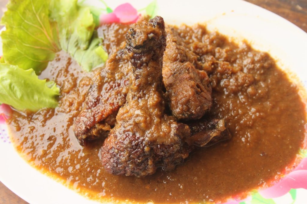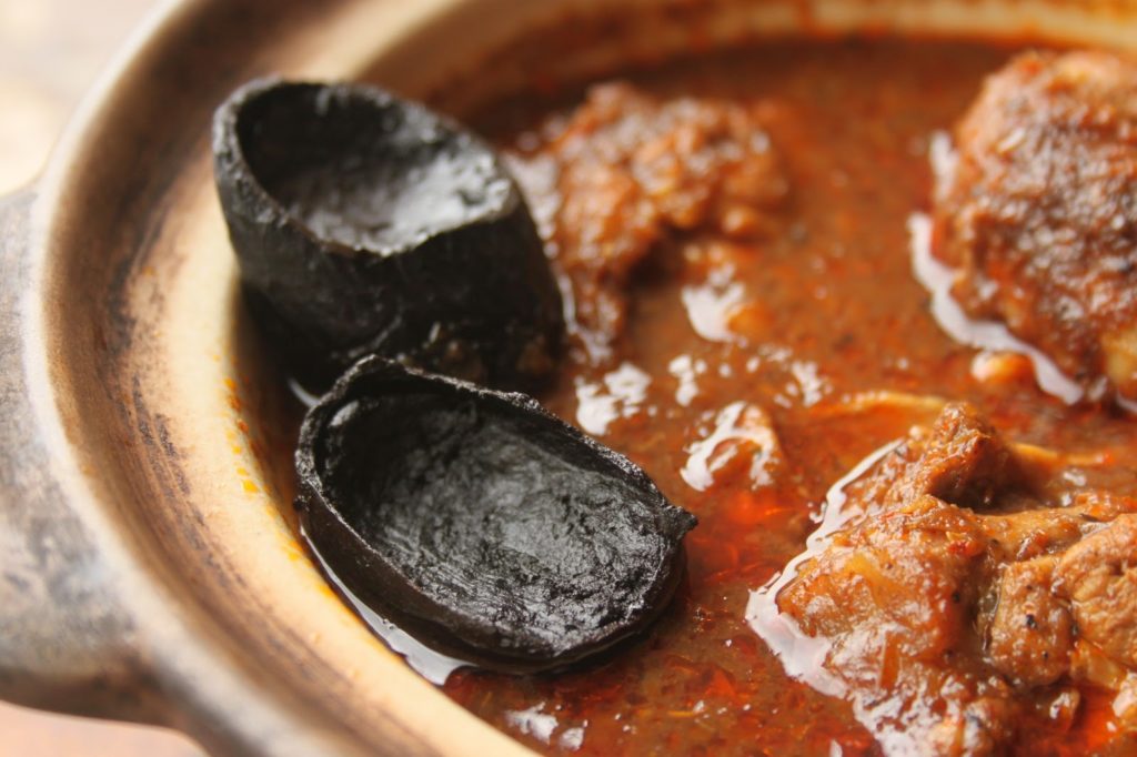 Et surtout le « ayam buah keluak », le poulet en sauce à la noix noire. La sauce est préparée avec de la citronelle, de l’oignon, des épices et de la chair de noix noire.
