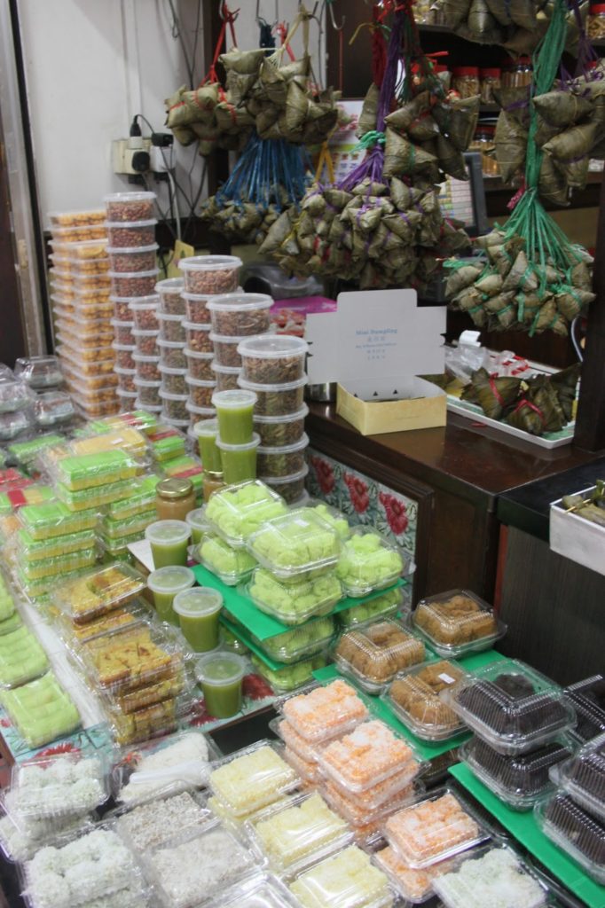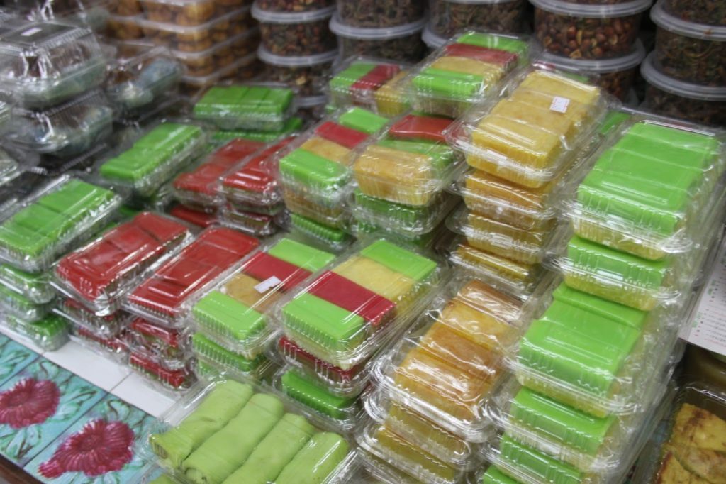 On trouvera des petites douceurs typiques de la culture peranakan, à base de farine de riz gluant, de farine de tapioca, de sucre de palme etc…