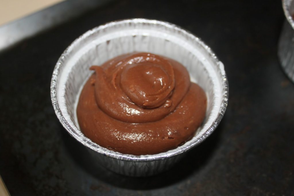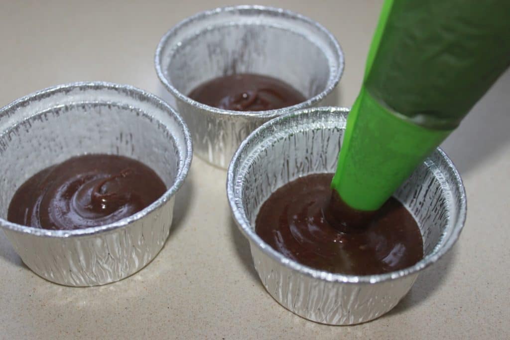 - Le lendemain, graissez vos moules (des moules en aluminium). Je mets du slider à canelés, mais une bombe de démoulage fera l’affaire. Mettez la pâte froide en poche munie d’une douille à large sortie (15 ou 20mm). Placez un peu de pâte dans le fond.