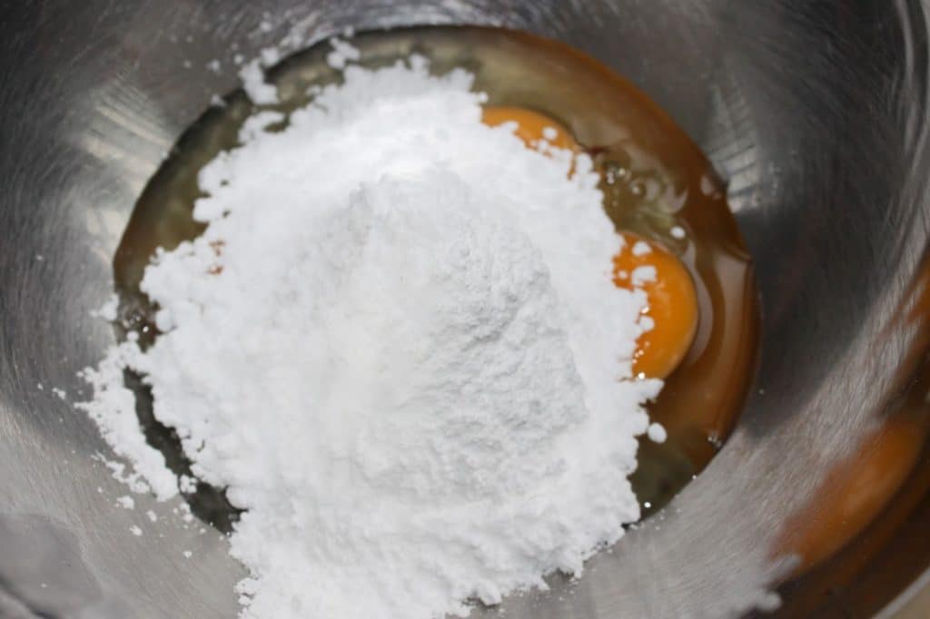 - Mélangez dans un autre récipient les œufs, les jaunes et le sucre glace.