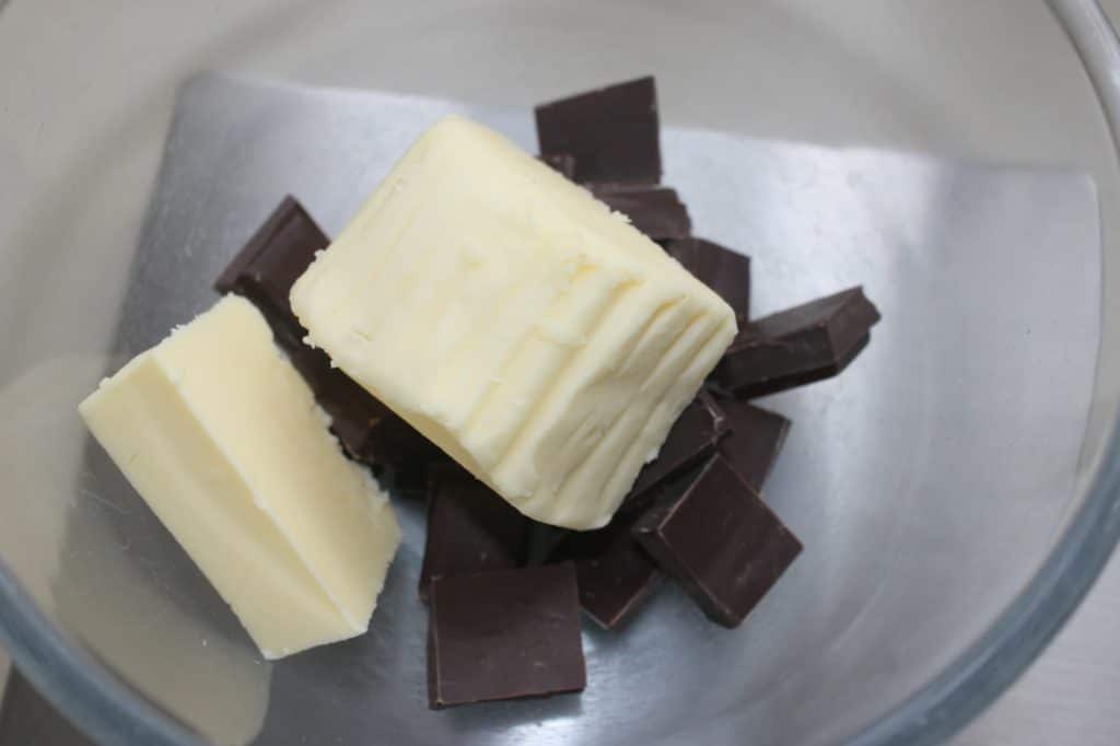 La veille aussi, faites la pâte. Faites fondre ensemble le beurre et le chocolat.