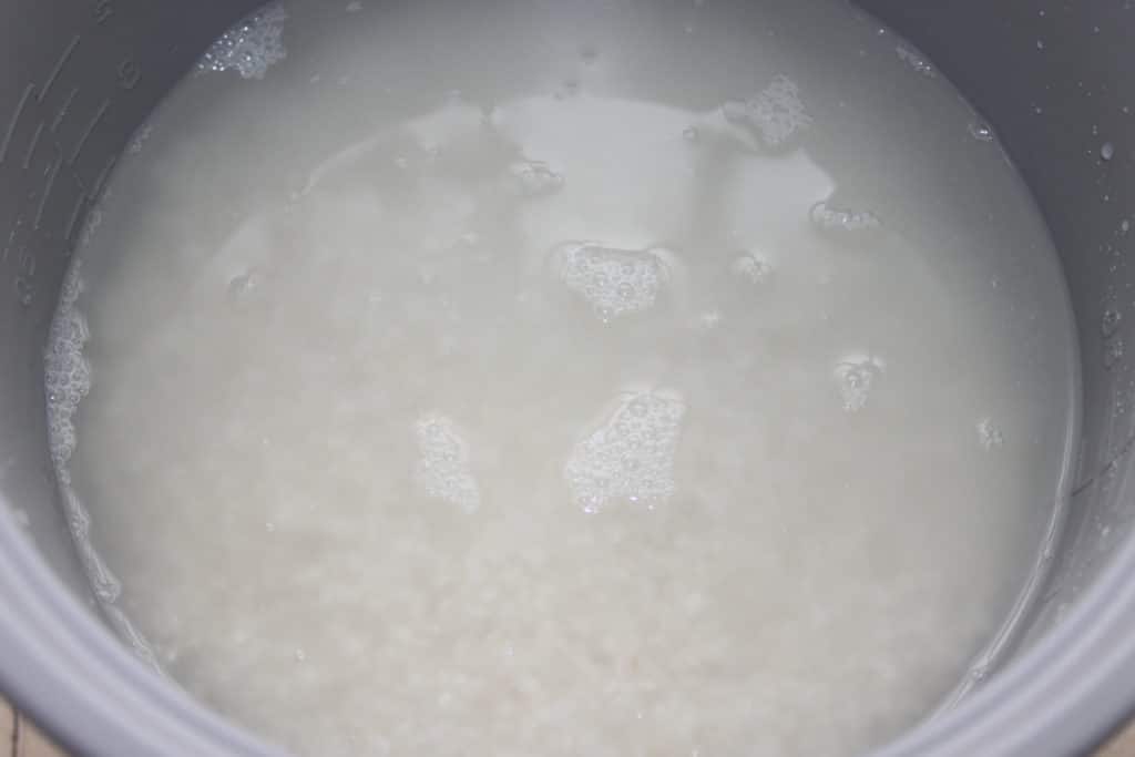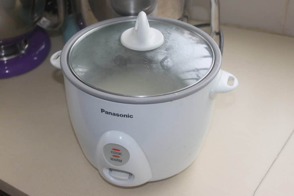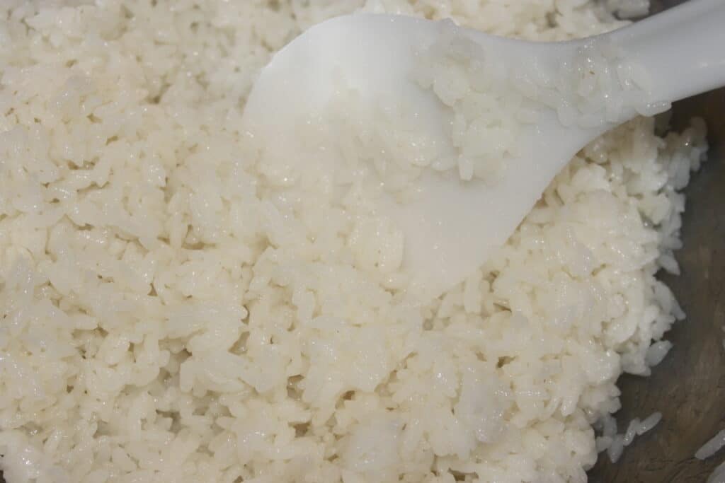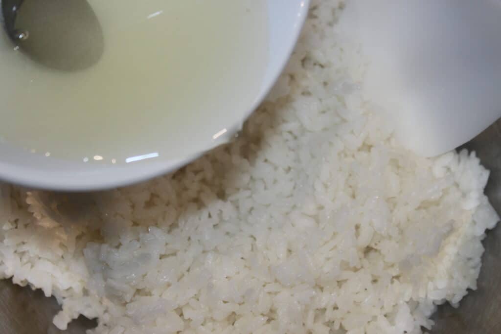 - Quand le riz est cuit, débranchez le rice cooker sans le couvercle. Laissez tiédir un peu puis versez-le dans un récipient. Versez progressivement la sauce vinaigrée. Mélangez sans écraser les grains de riz, il faut faire bien attention.