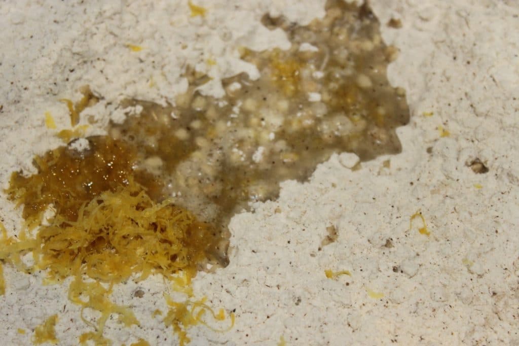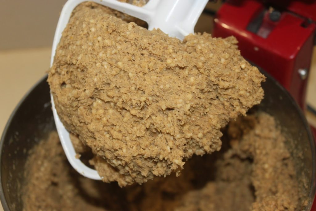 - À ce stade, la pâte ne sent pas bon, cela est dû à la potasse. Mais en cuisant, celle-ci disparait totalement. L’interêt de la potasse est qu’elle fait gonfler la pâte d’une manière très différente de la levure chimique ou du bicarbonate de sodium. La pâte a tendance a poussé sur les côtés et non vers le haut. Vous pouvez quand même remplacer la potasse par du bicarbonate de sodium plus classique. mais la pousse n’est pas tout à fait identique.
