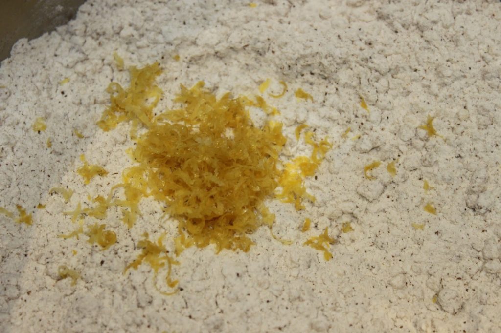 - Dans la farine, versez le zeste d’un demi-citron bio.