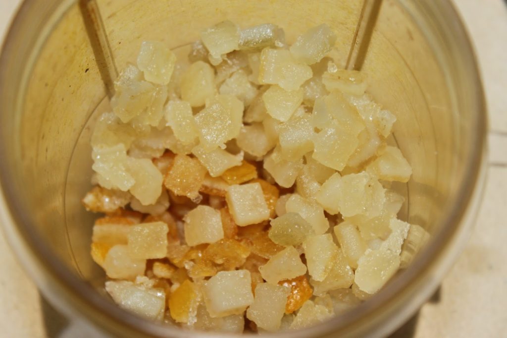 - Hachez les écorces d’orange et de citron confits pour les réduire en plus petits morceaux. Vous les trouverez sur internet ou même en rayon pâtisserie du supermarché (même Vahiné en fait).