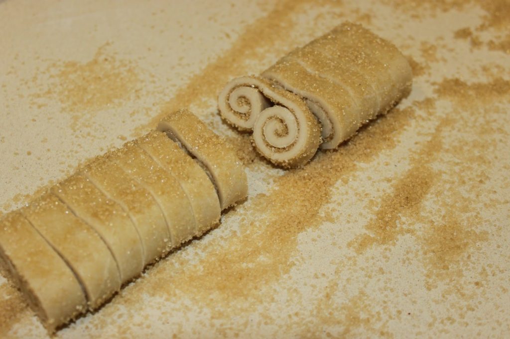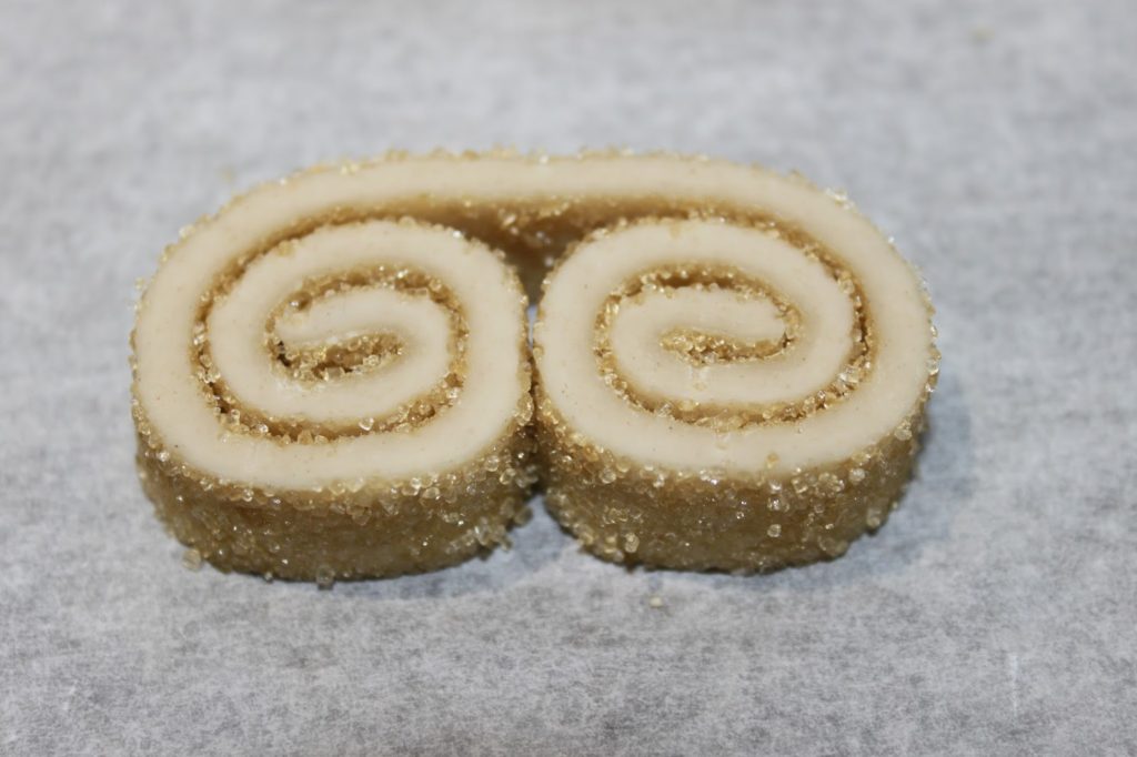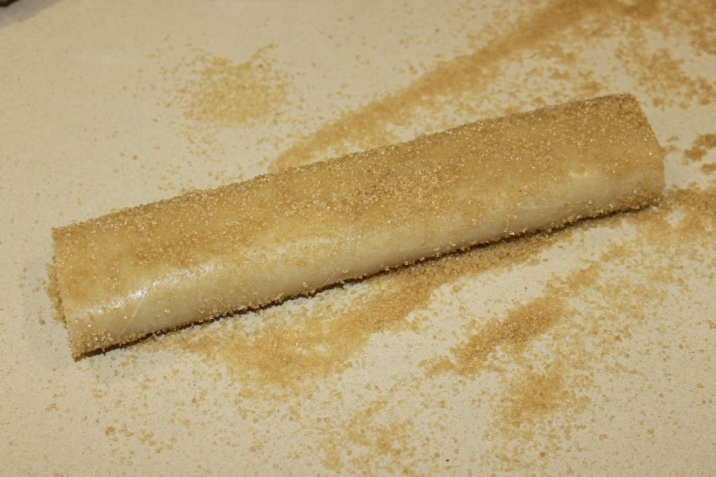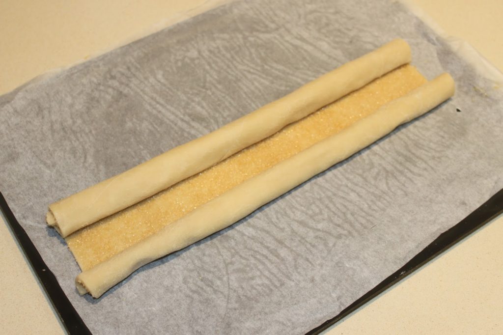 NB: vus voyez sur la photo que l’enroulement laisse apparaitre que l’autre face n’a pas été sucrée. C’était un essai et je préfère avec sucre sur les deux côtés ! Si vous voulez de plus gros palmiers, il suffit d’enrouler dans la longueur vers le centre, et pour des plus petits, dans la largeur vers le centre (comme sur la photo).