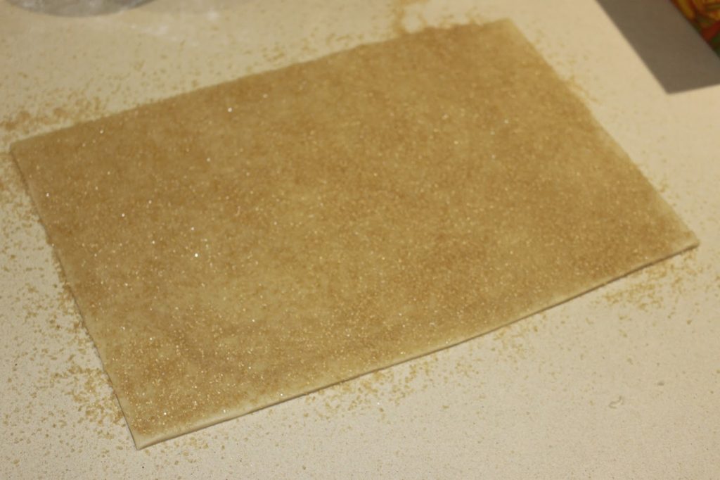 - Étalez en rectangle. Coupez les bords au besoin pour avoir un rectangle le plus beau possible. Mouillez très légèrement la surface avec de l’eau, puis enlevez l’excédent avec un papier absorbant. De cette façon, la pâte va être collante. Saupoudrez de sucre roux.