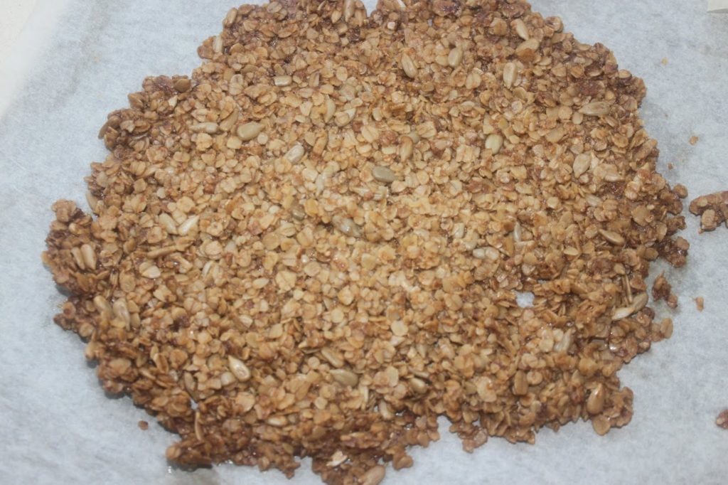 - Mélangez bien. Versez sur une plaque garnie de papier sulfurisé. Aplatissez légèrement et mettez au four à 170°C pendant 20 minutes