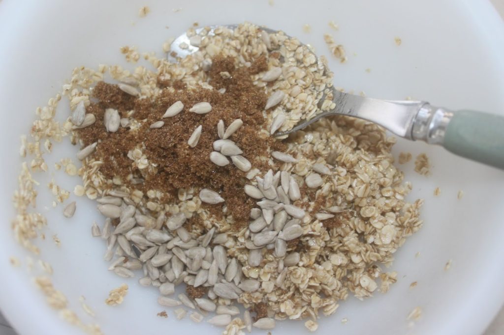 - Mettez vos ramequins au frais.Mélangez les flocons d’avoine avec l’huile, le sirop d’agave.