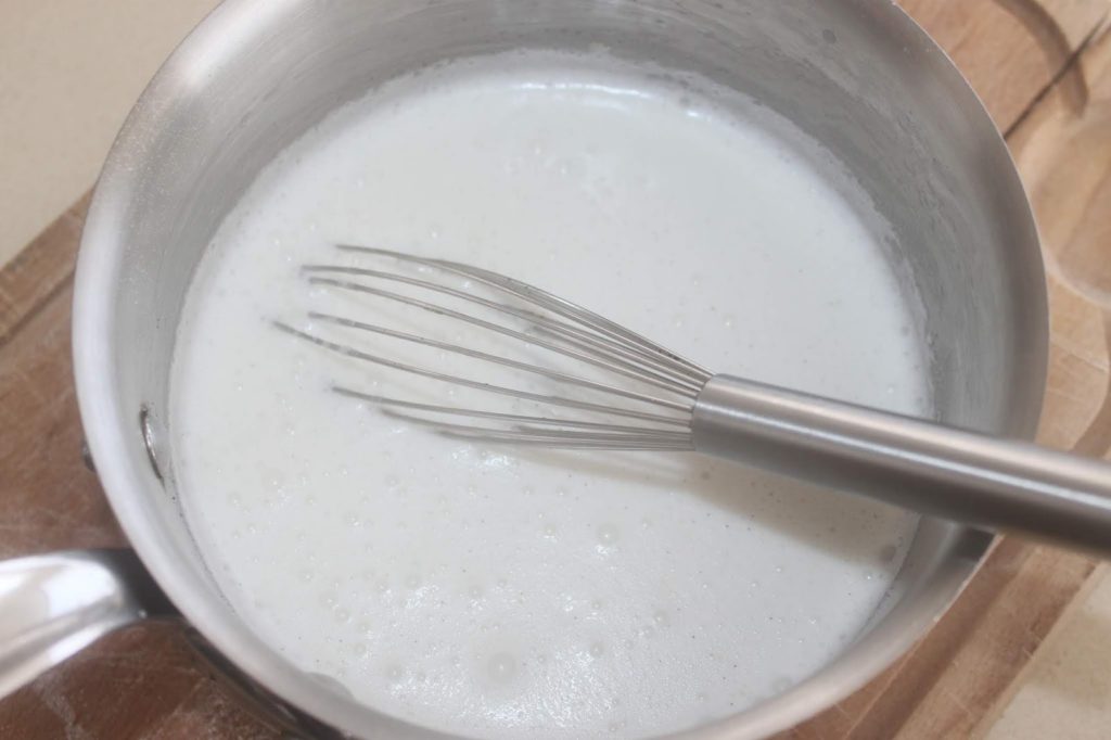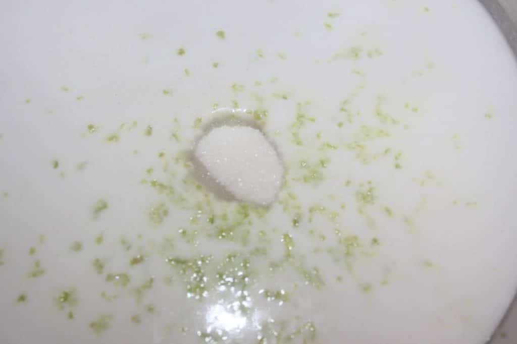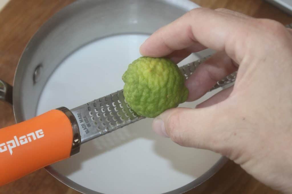 - Versez le lait de coco dans une casserole avec le zeste du combava. Ne mettez pas forcément le zeste entier, juste une partie car c’est assez fort.