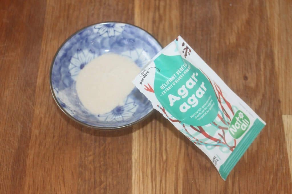 Pour l’agar-agar, souvent les sachets sont de 4g. Versez juste un tout petit plus de la moitié !