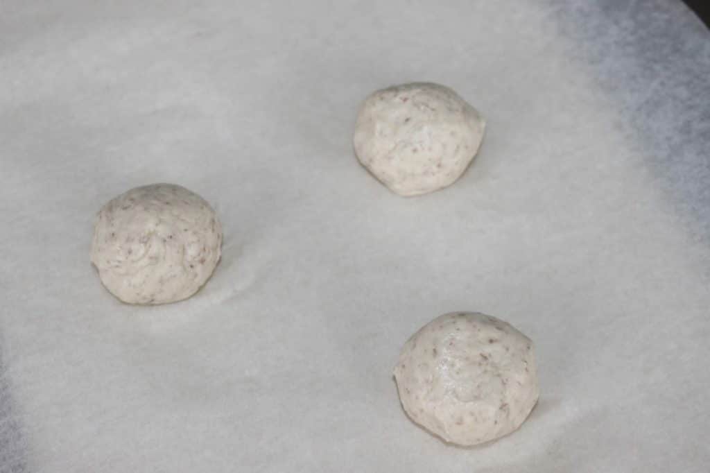 Faites de boulettes grosses comme des noix. Posez-les sur du papier sulfurisé.