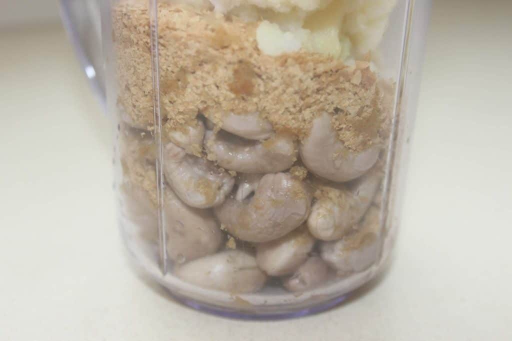 Mettez les noix de cajou trempées et égouttées (elles ont un peu gonflé), les flocons de levure maltée, la purée de pomme de terre dans un mixeur. Je vous conseille un mixeur de taille normale et pas un si petit que le mien. J’ai pris les photos pendant mes tests.