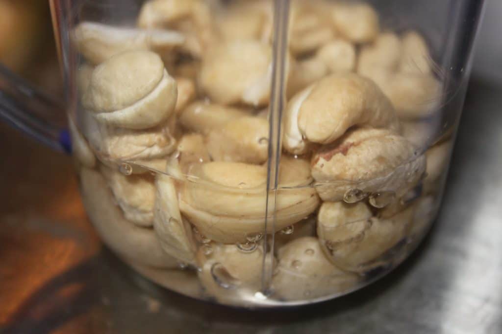 En primer lugar, ponga los anacardos crudos en un bol con agua fría al menos tres horas antes de hacer la receta. Deben estar completamente cubiertos. Se hincharán un poco al absorber agua (aproximadamente un 30% de su peso).