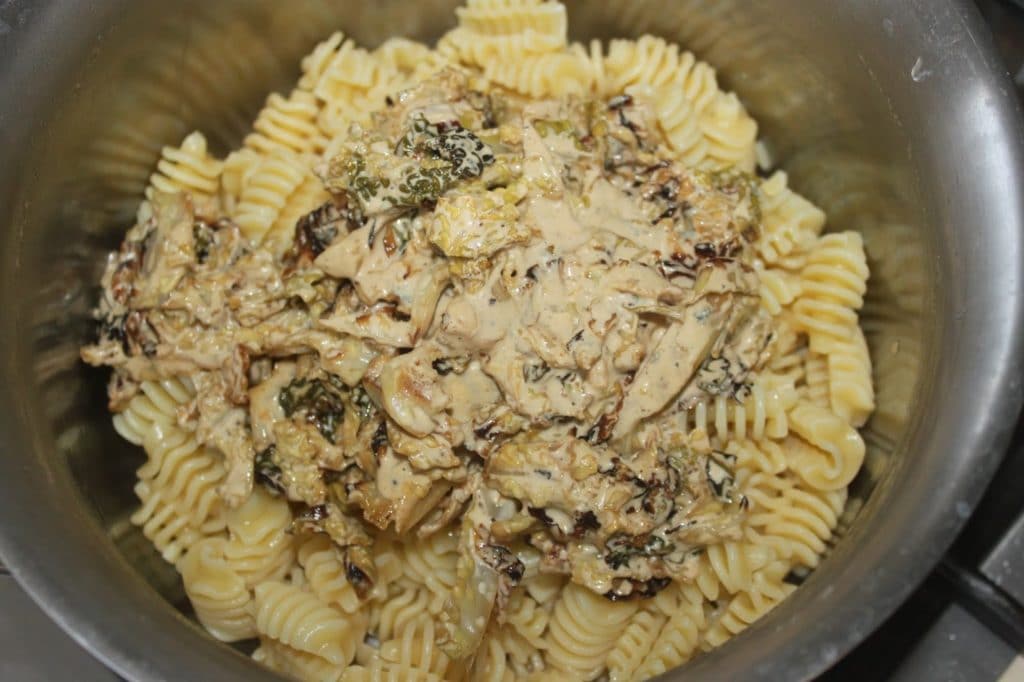 - Reversez-les dans la marmite et versez le chou vert à la crème de Fourme d’Ambert.