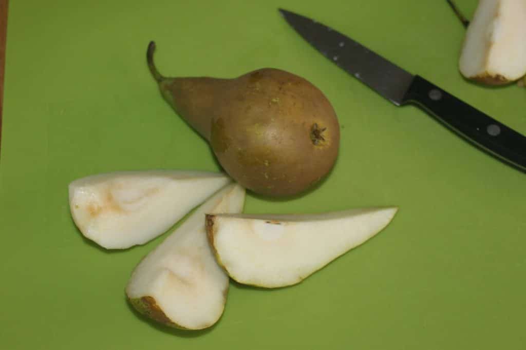 - Recoupez chaque quartier en morceaux plus fins. Versez un peu d’huile d’olive dans une petite poêle et posez les morceaux de poire.