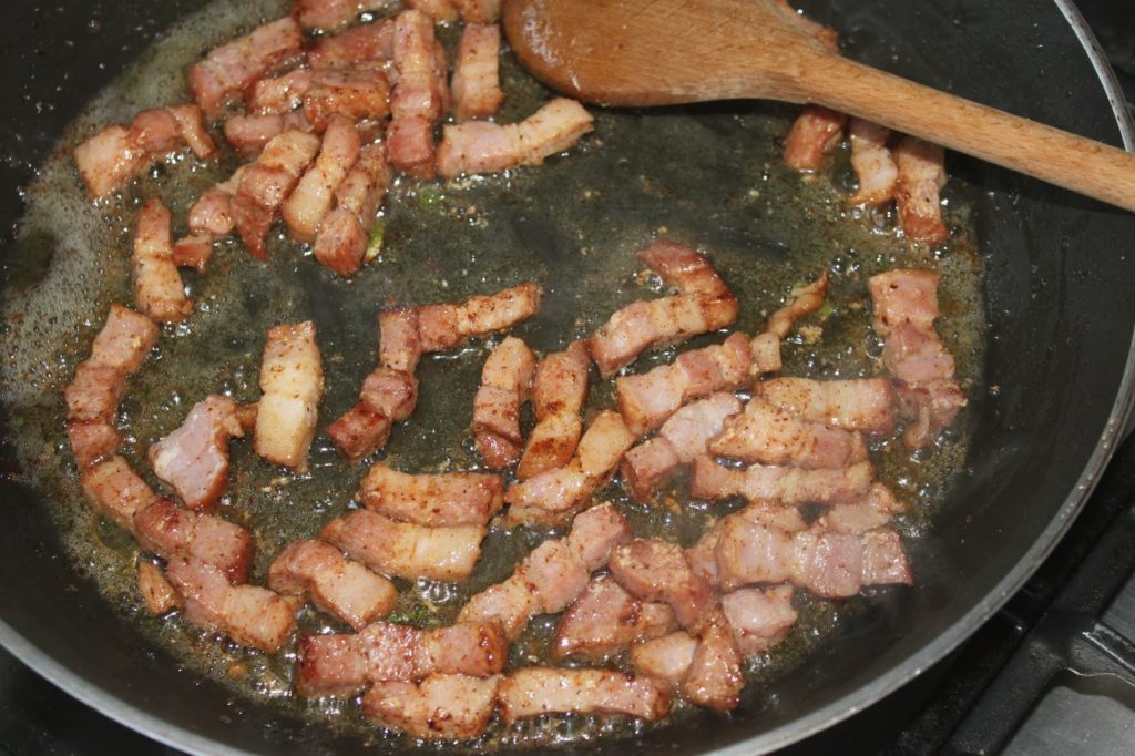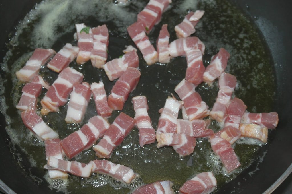 - Mettez le beurre demi-sel et l’huile d’olive dans une large poêle. versez les lardons.