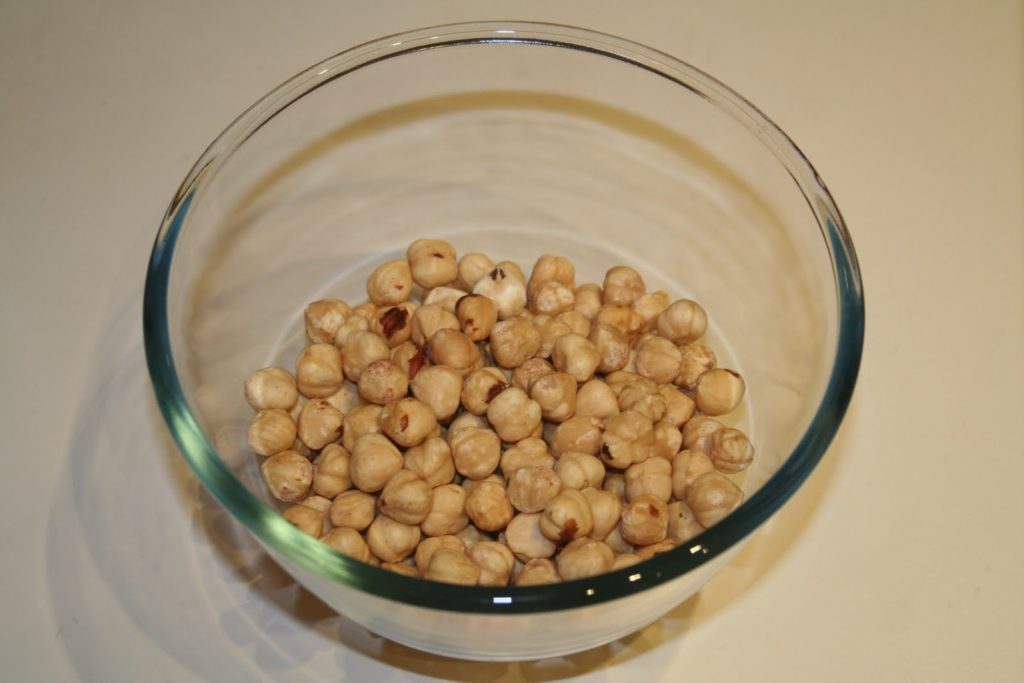 Si l’on n’a pas de noisettes déjà grillées et pelées dans le commerce à côté de chez soi, on peut dans ce cas acheter des noisettes et les passer au four à 180°C pendant 10 minutes en surveillant. Il faut ensuite les mettre dans un torchon propre et bien les frotter les unes contre les autres. Elles vont alors se peler toutes seules. Si elles ne le sont pas toutes, rien de bien alarmant!! En les broyant, on n’y verra que du feu.