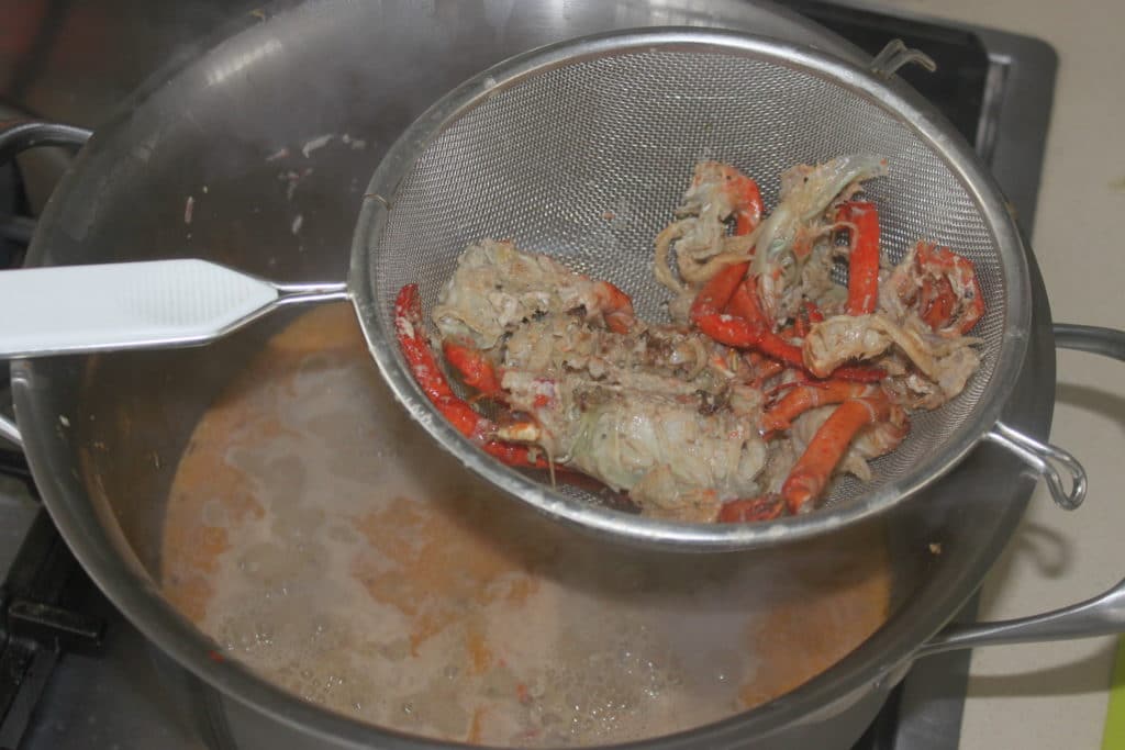 Poner los cuerpos y las patas en un colador, enjuagar un poco con el agua fresca que se recoge en la olla.