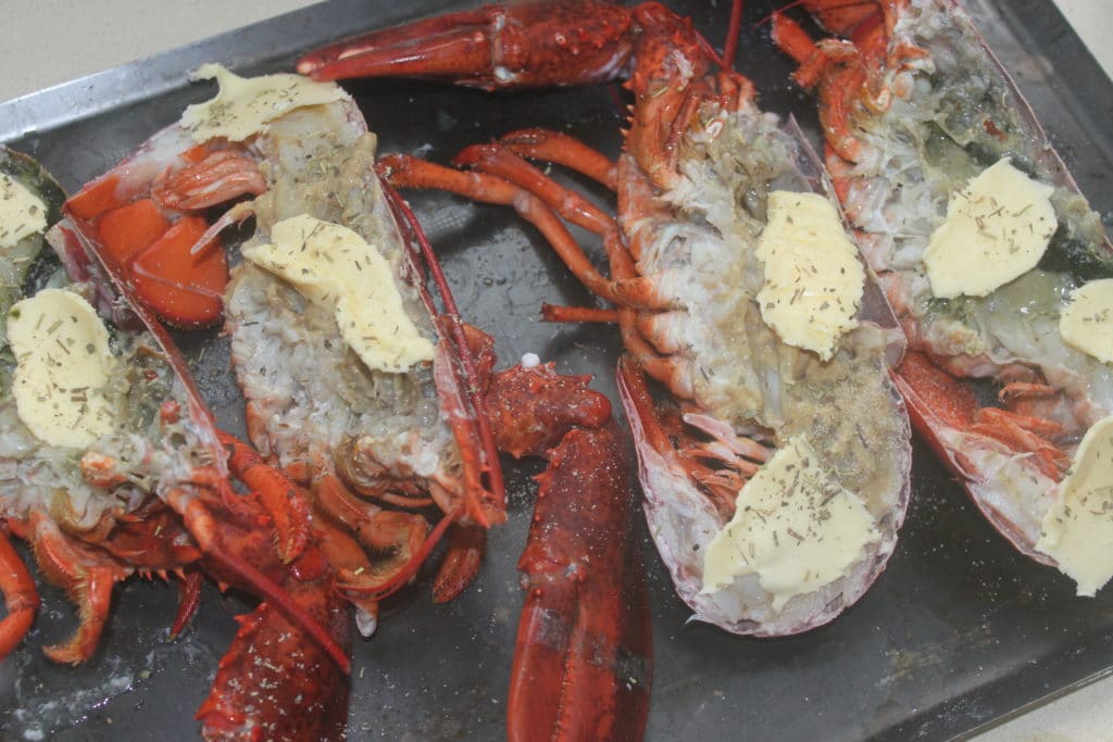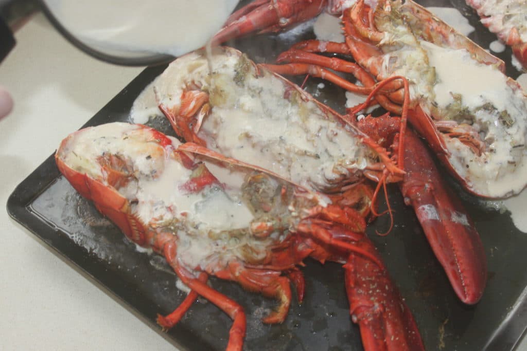 Dividir los 25g de mantequilla en 8 porciones y colocarlas sobre el bogavante. Salpimentar y añadir un poco de hierbas de Provenza. Introducir en el horno precalentado a 205°C con grill si es posible durante 10 minutos.