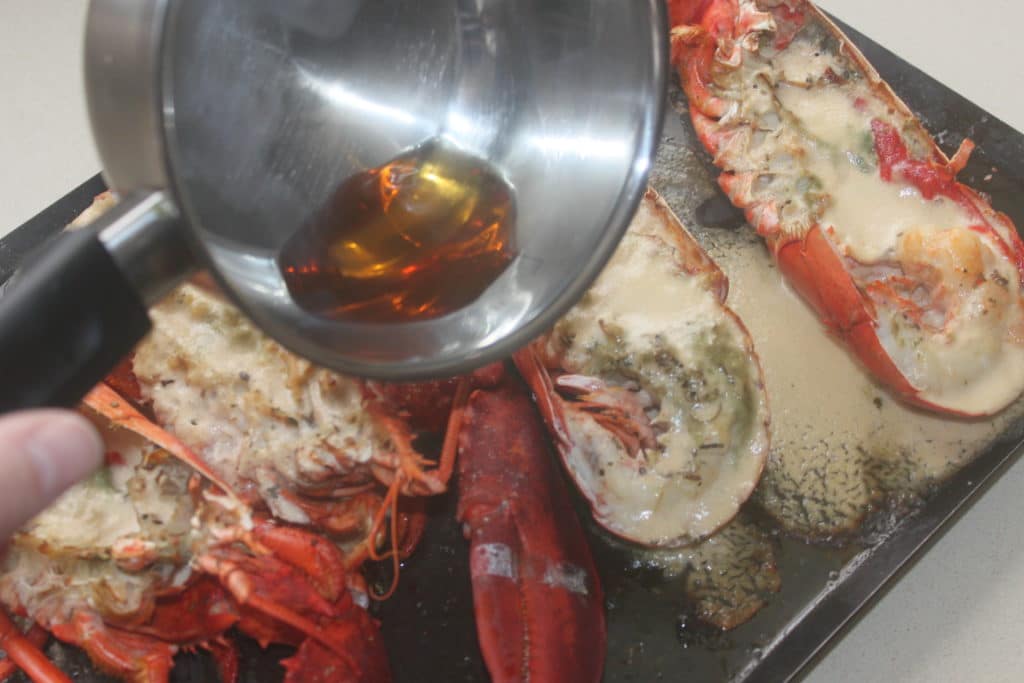 Vuelva a ponerlo en el horno durante 3-4 minutos y durante este tiempo caliente el coñac. Sacar el bogavante y verter el coganc que se flambea.