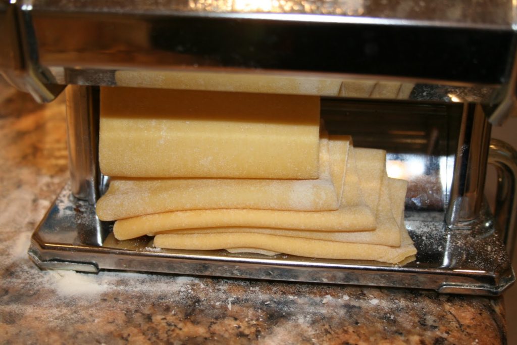 Passer à chaque deux ou trois fois sur chaque cran chaque bande de pâte. Au deuxième cran, couper les bandes en deux car sinon les bandes deviennent trop longues. Sauf bien sûr si c’est un choix!