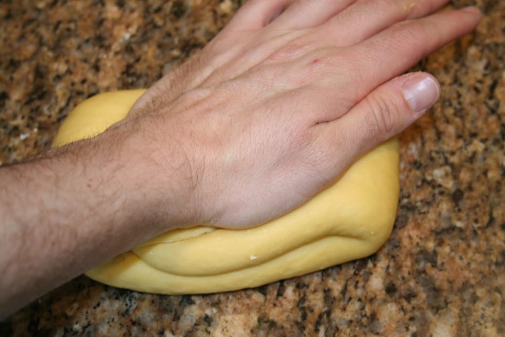 - Ecraser la pâte de la paume de la main. Tourner la pâte de 90° puis rouler de nouveau en boudin et ainsi de suite. Procéder de cette façon pendant au moins dix minutes.