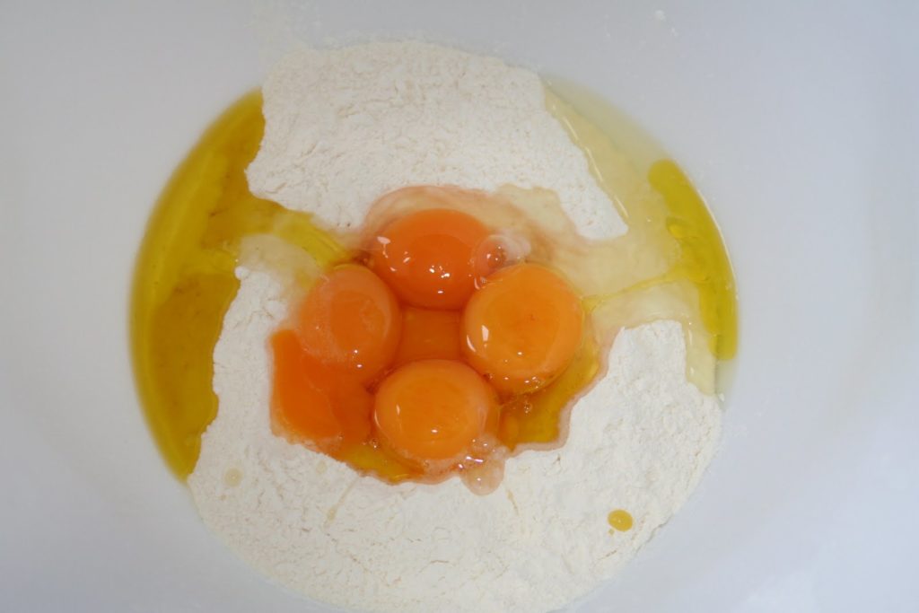 Commencer par mettre la farine dans une jatte, ou le bol du pétrisseur si on en a un. Creuser un puit au milieu et ajouter l’oeuf, les jaunes et l’huile d’olive.