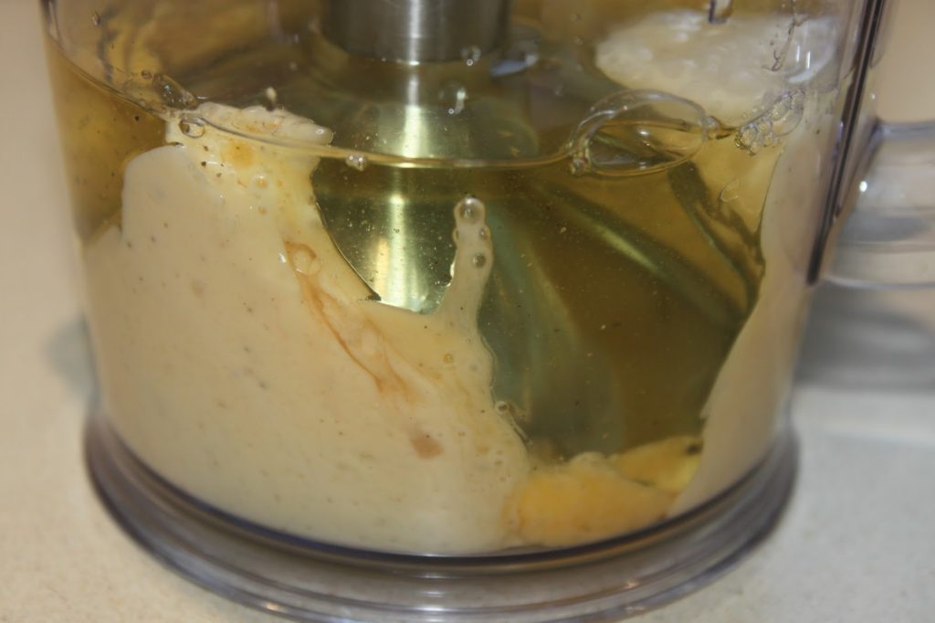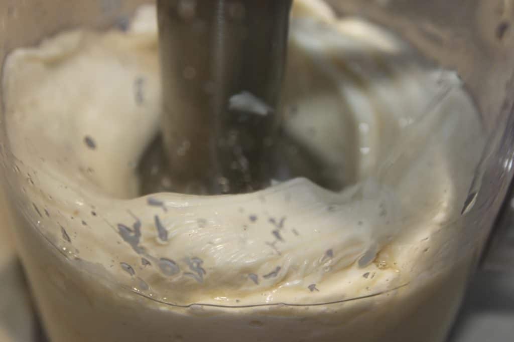Avec un mixeur plongeant, commencez à mixer dans le bas sans bouger. Quand la sauce prend (c’est normalement instantané), remontez lentement pour émulsionner le reste de l’huile.