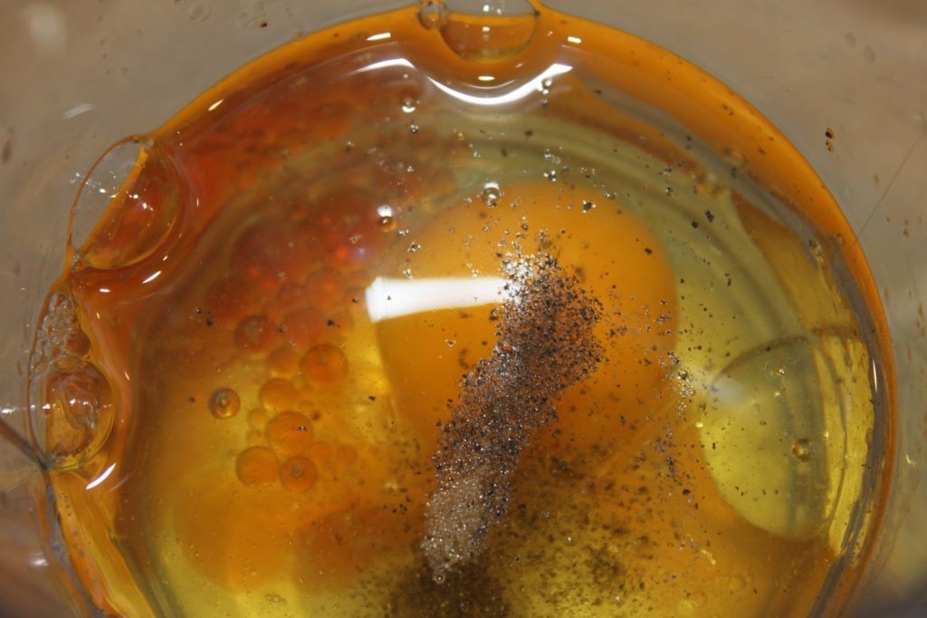 - Pour la sauce, mettez l’œuf, l’huile et le vinaigre dans un récipient haut et long. Salez et poivrez suffisamment.