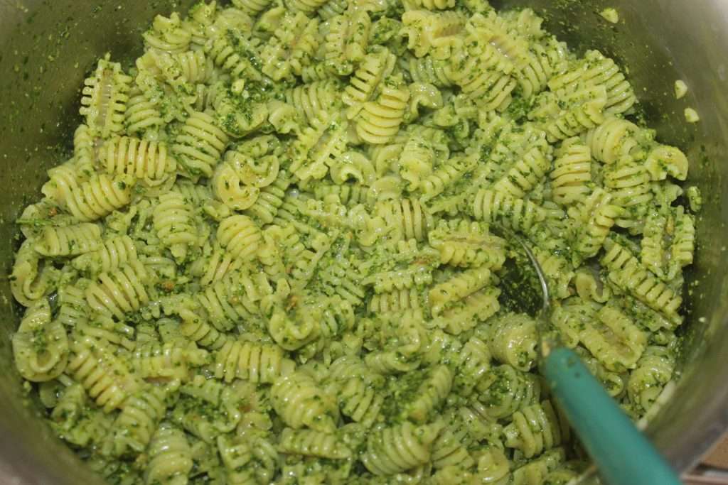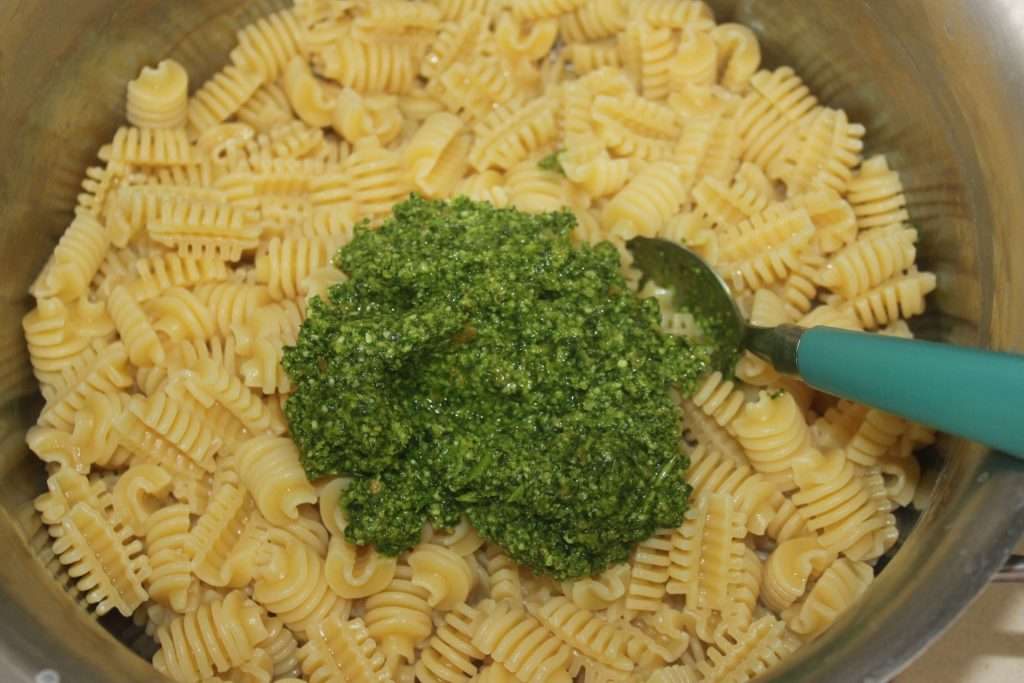 Cuando esté listo para comer, cocine la pasta al dente como se indica en el paquete. Escúrralos y añada el pesto.