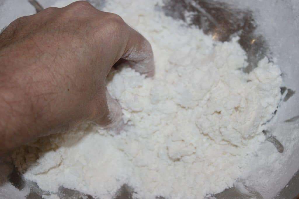 - Mélangez en pétrissant bien la pâte. Versez ce que vous avez sur un plan de travail.