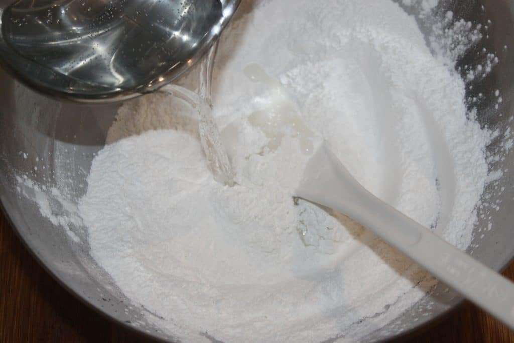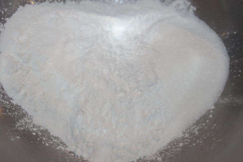 - Mélangez la farine de riz gluant et le sucre dans un récipient.