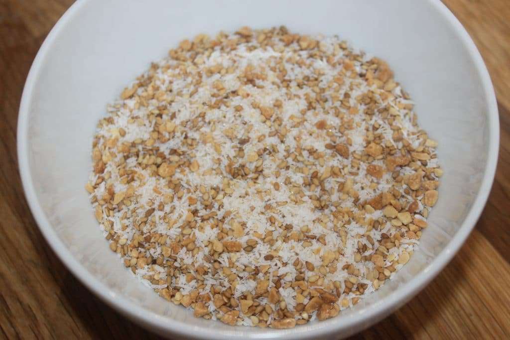 - Mélangez les cacahuètes, sésame, noix de cacahuètes et le sucre et c’est tout.