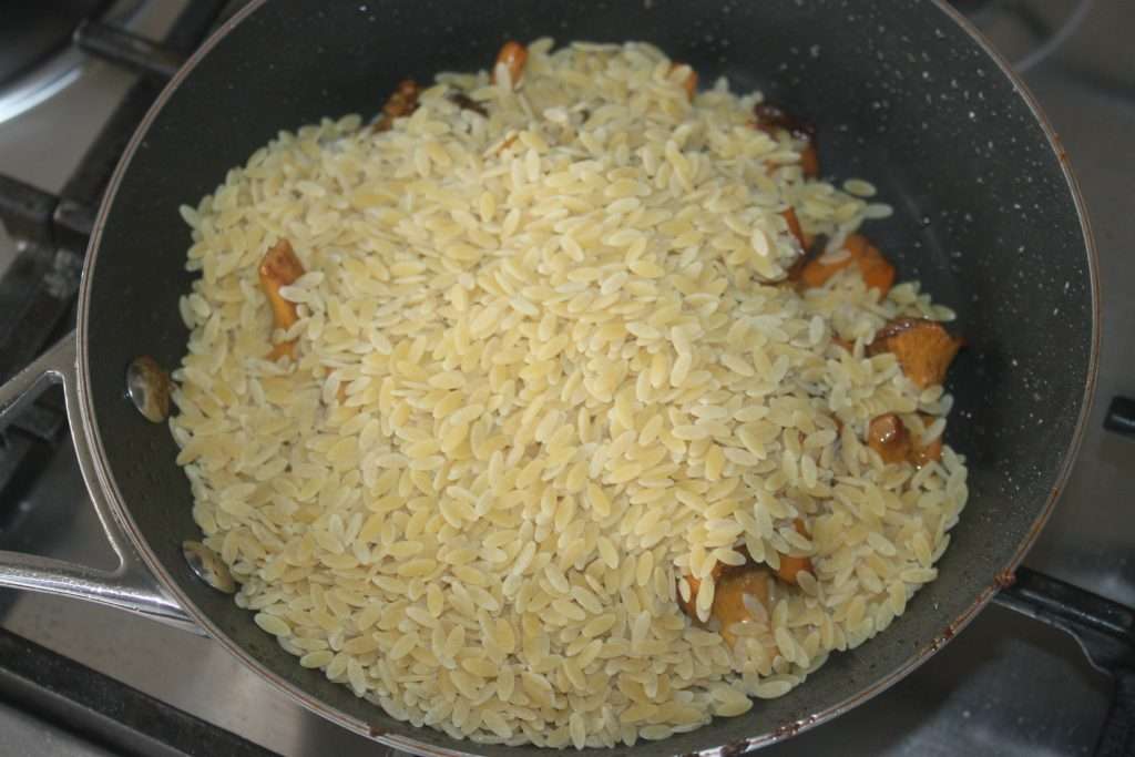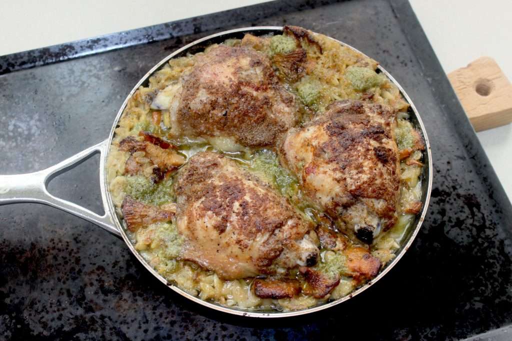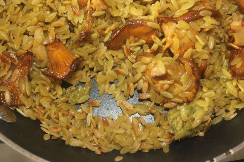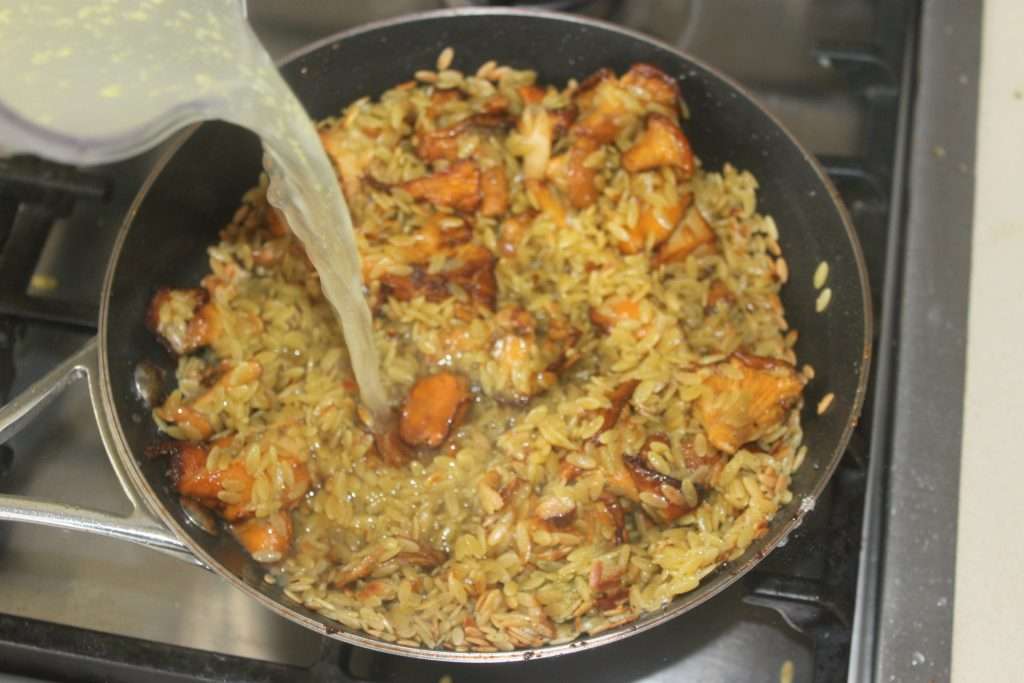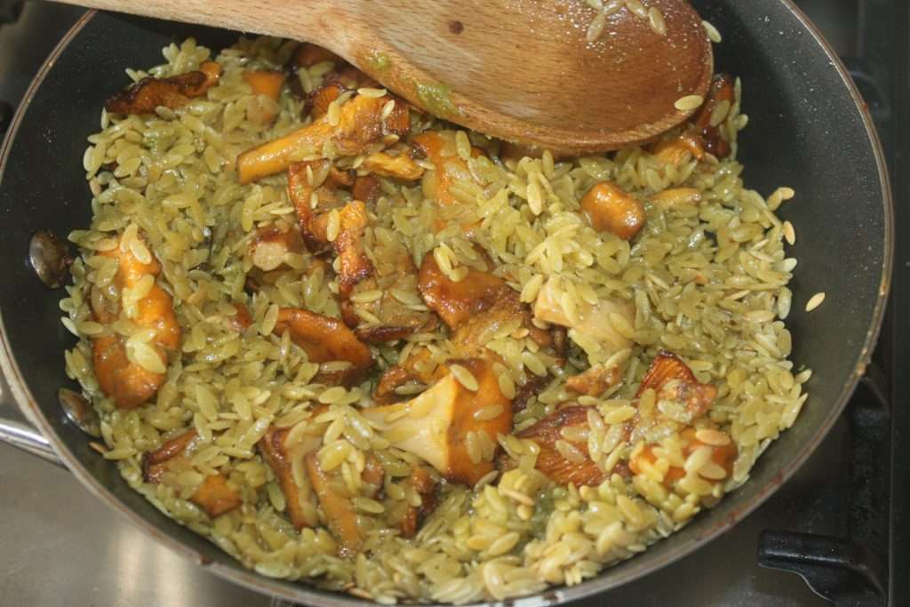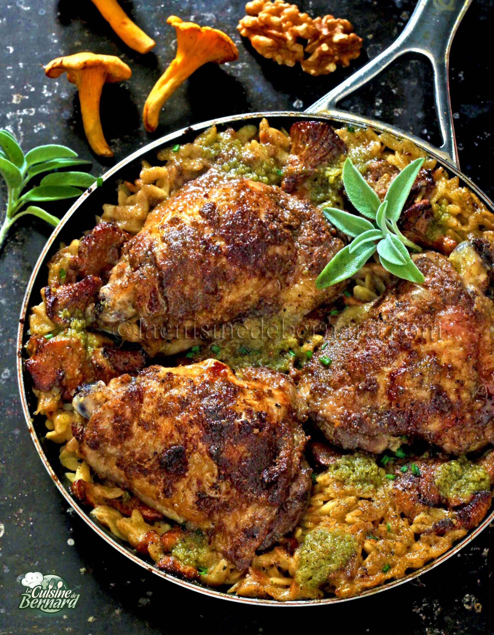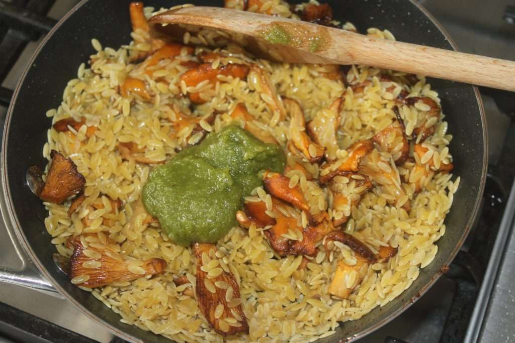 Poêlée de pâtes Orzo, chanterelles, poulet et pesto noix-sauge
