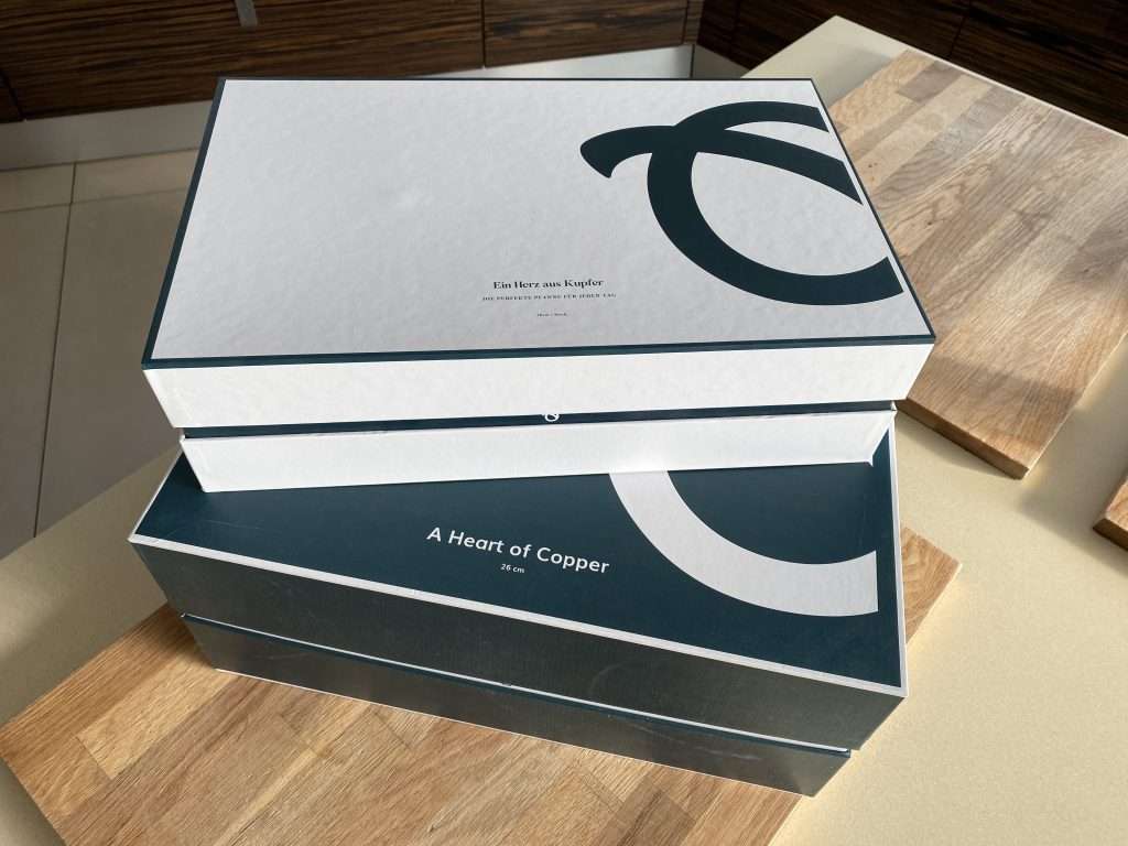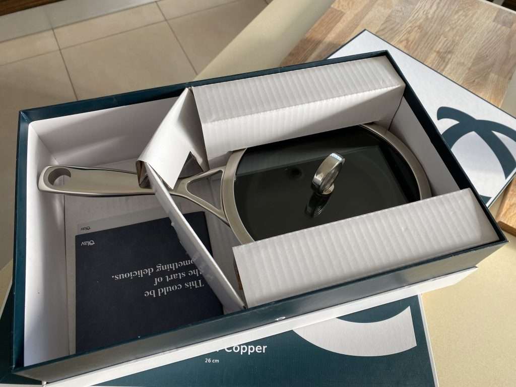 Aquí están las cajas que he recibido. El envase es realmente perfecto para hacer un bonito regalo. Olav es una start-up alemana. Todas las ollas y sartenes tienen núcleo de cobre y ofrecen su propio servicio de recubrimiento.