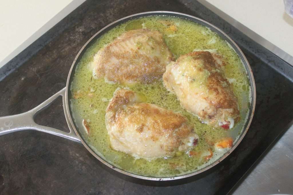 Se pueden dejar marinar durante una hora, o se puede continuar en la misma línea. Poner la sartén a fuego fuerte y colocar los muslos con la piel hacia abajo.