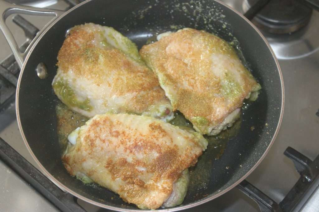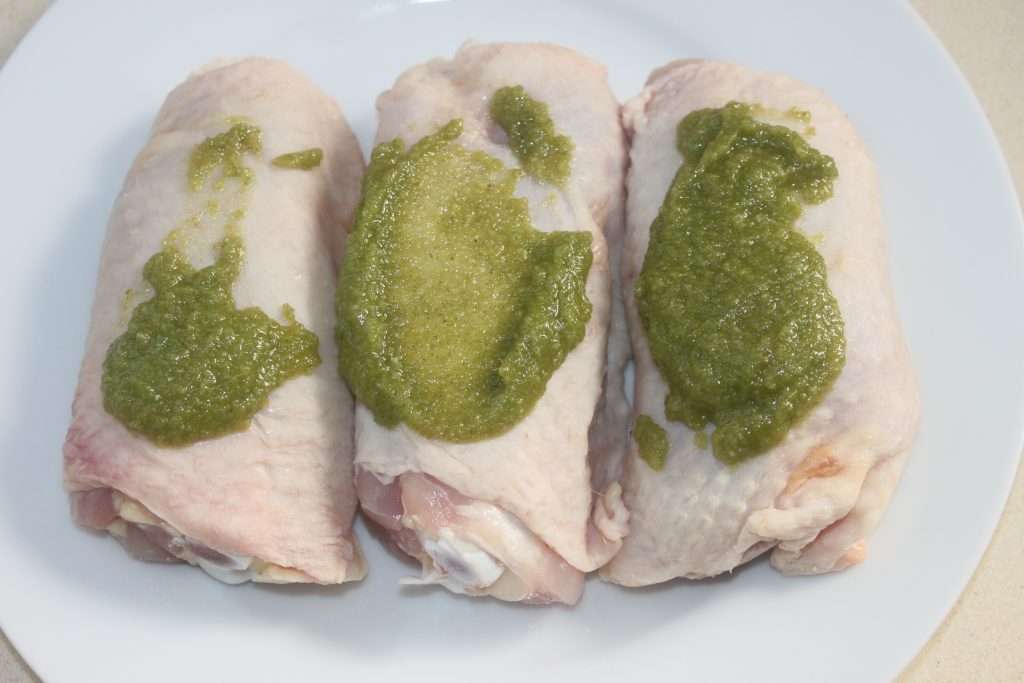 - Prenez les hauts de cuisses, et badigeonnez-les de pesto sur tous les côtés. Gardez 2-3 cuillerées à café de pesto pour la suite. Je n’ai que trois hauts de cuisses, mais prenez-en 4 !