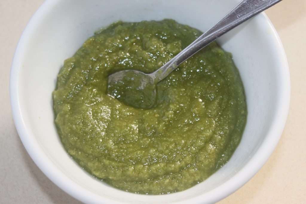 Coge los muslos y úntalos con el pesto por todos los lados. Guarde 2-3 cucharaditas de pesto para después. Sólo tengo tres muslos, ¡pero toma cuatro!