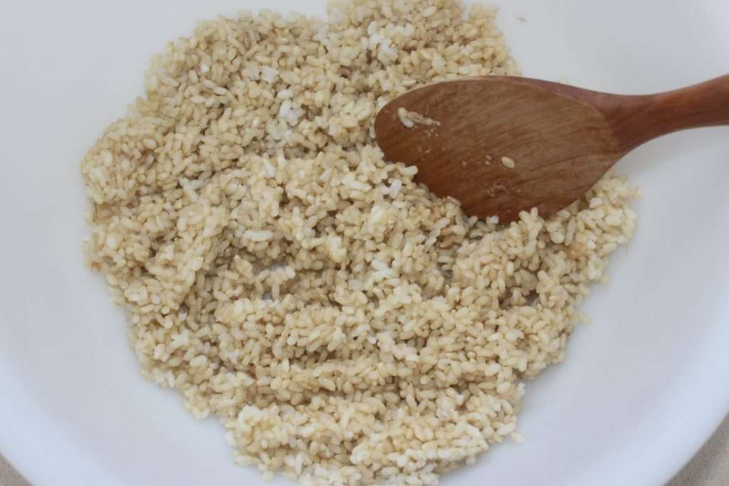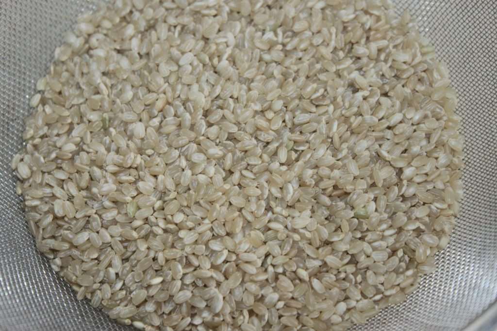 - Le lendemain, faites cuire le riz rond complet. Lavez-le à l’eau froide pendant 1 minute. Placez-le dans un rice cooker avec 300g d’eau, fermez le couvercle et mettez en route.
