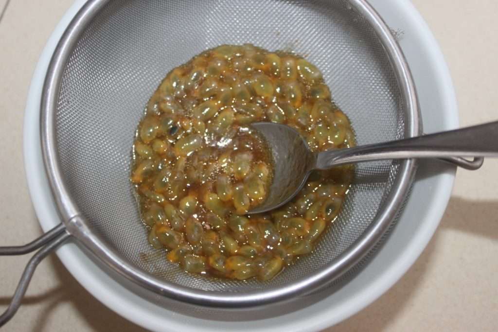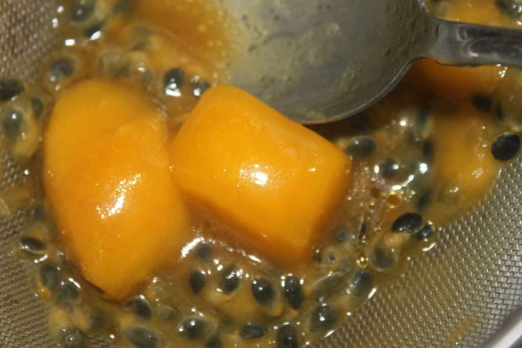 - Ajoutez 2-3 morceaux de mangue. J’avais pris de la mangue congelée qui s’écrase bien. Écrasez-la bien à la fourchette puis mélangez le tout dans le tamis. Mélangez pour que tout le liquide tombe en dessous. Il ne restera dans le tamis, que les graines du fruit de la passion. Il faut donc bien écraser la mangue !