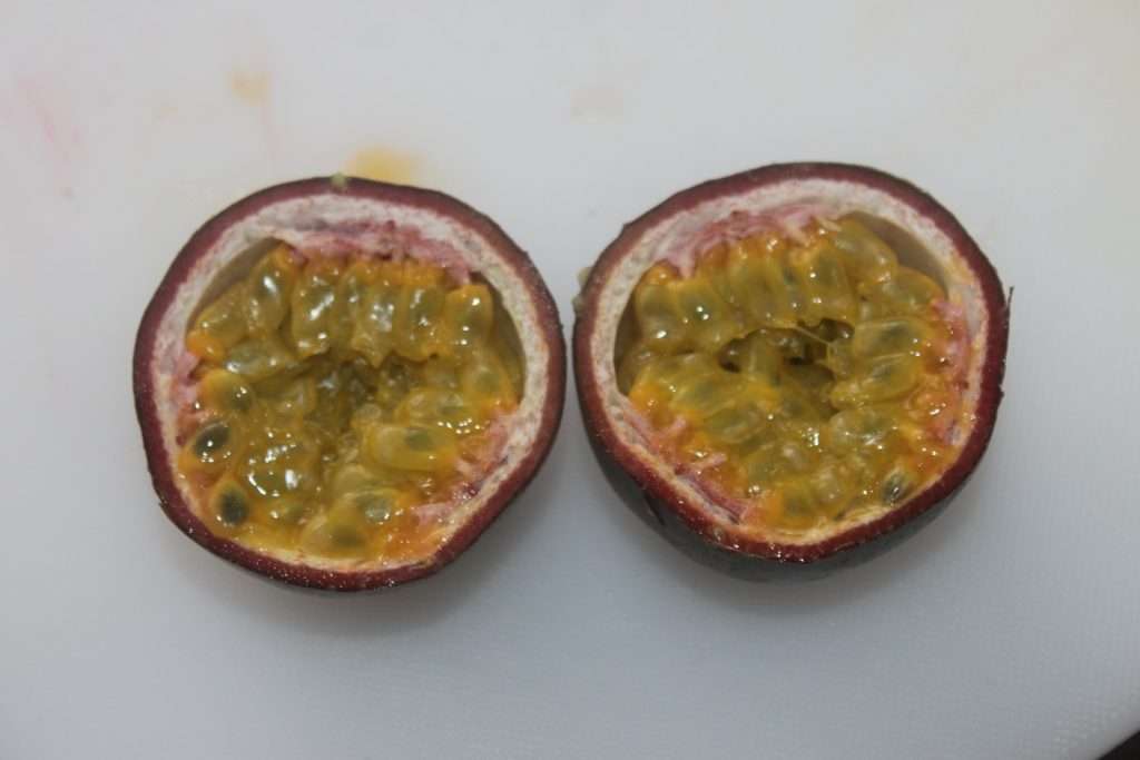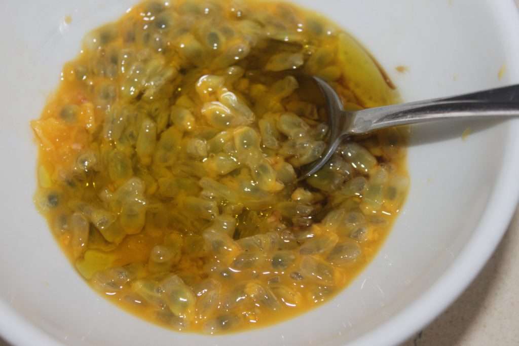 - Pour la sauce, récupérer la chair d’un beau fruit de la passion.