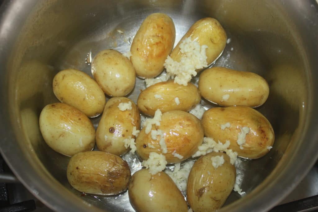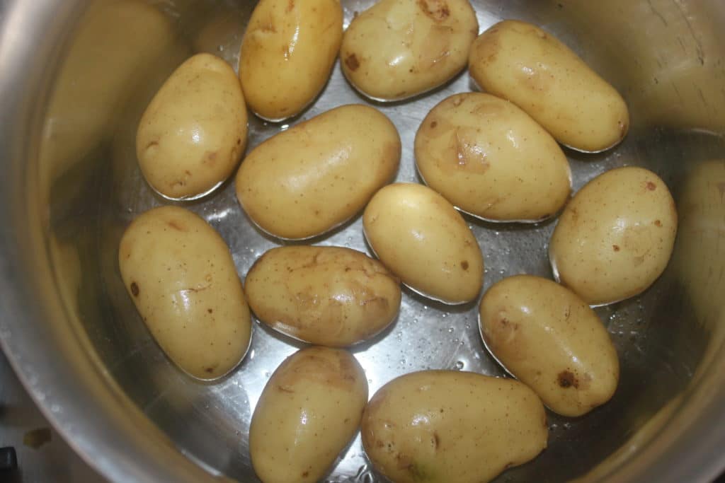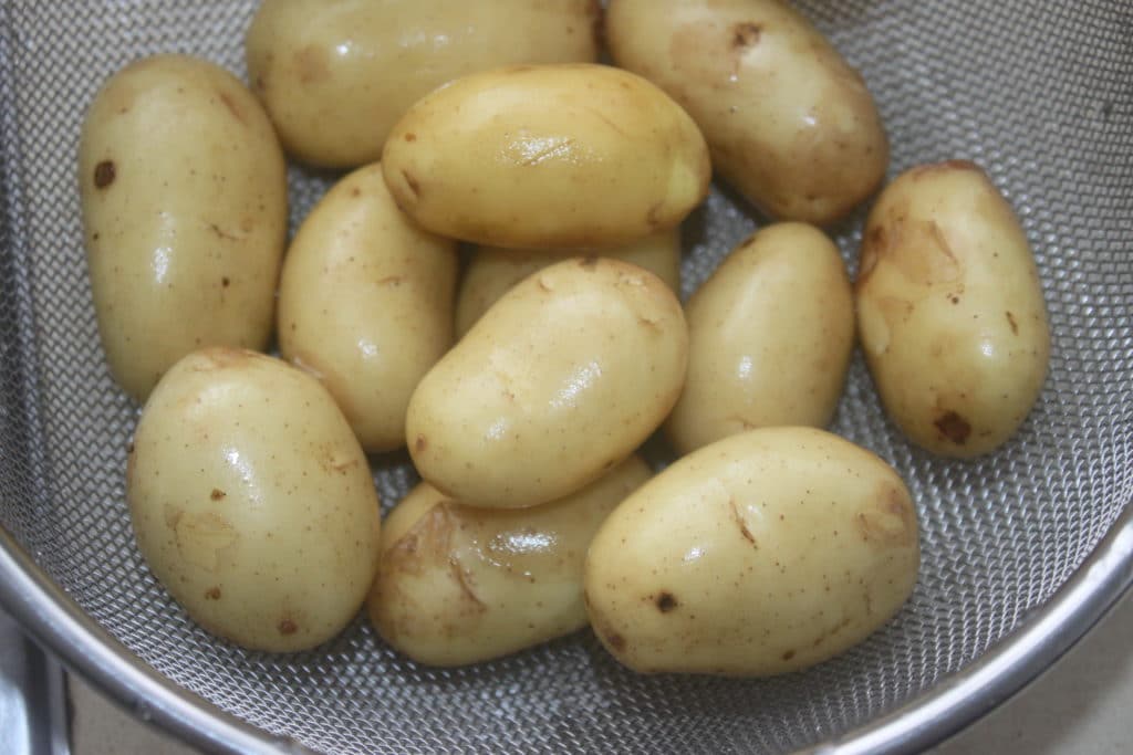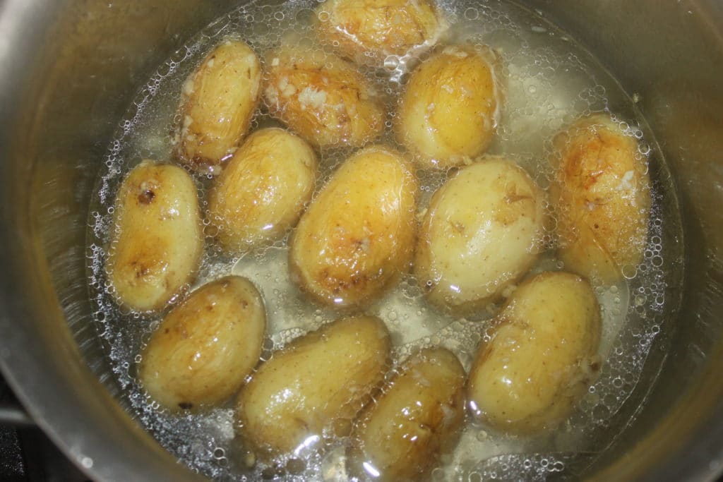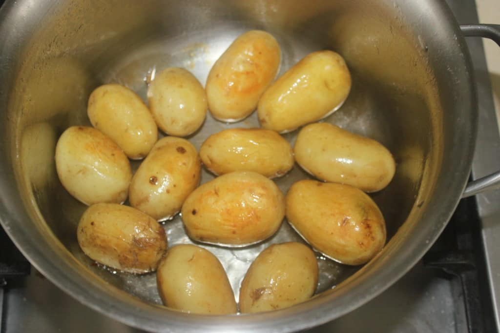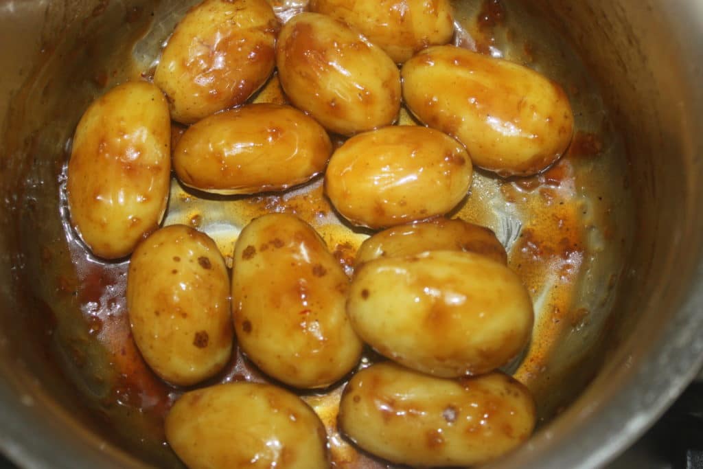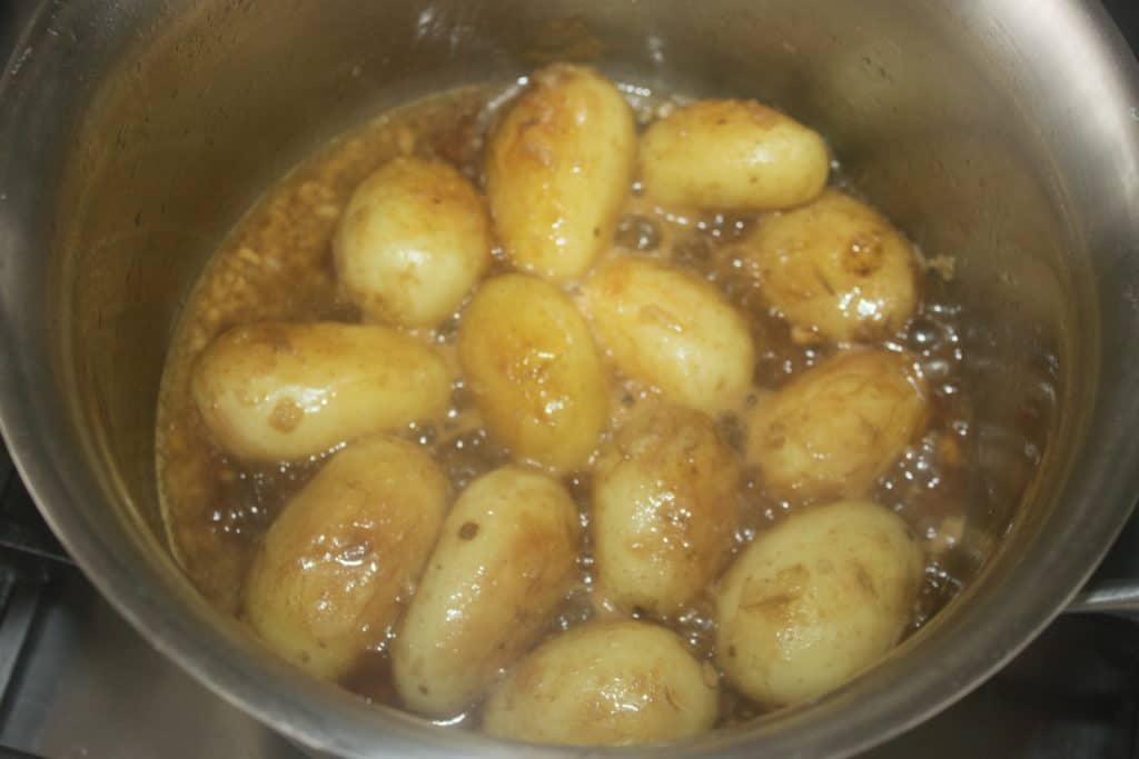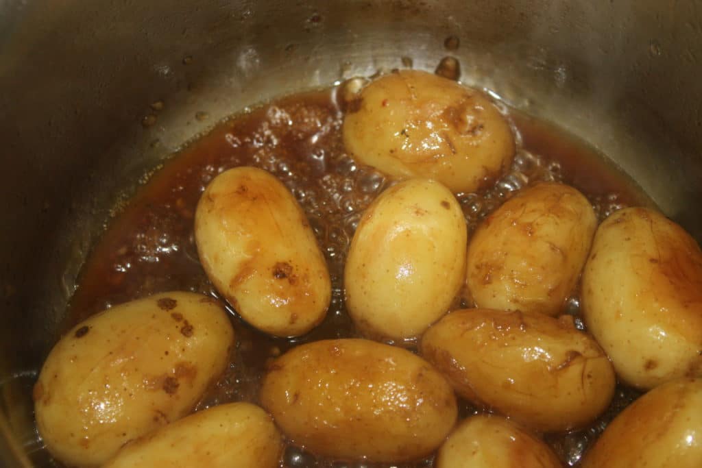 - Lavez les pommes de terre à l’eau claire. Prenez des petites pommes de terre et surtout laissez la peau et ne les coupez pas. Si vous les coupez en deux, l’amidon va donner une sauce qui ne sera pas du tout sirupeuse. Pour avoir un joli brillant, il faut donc les laissez entières !