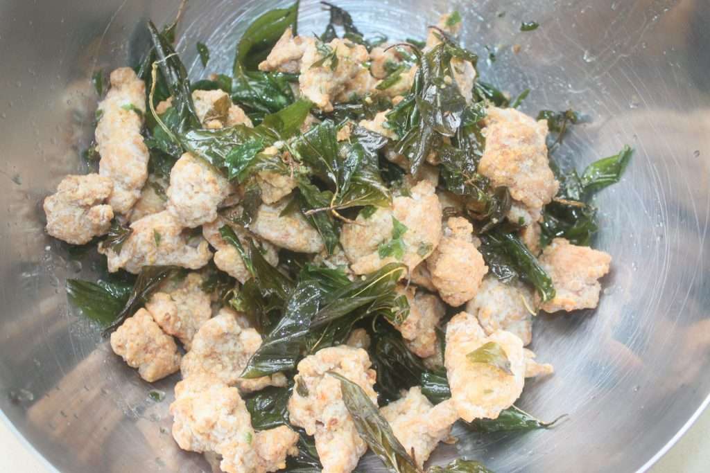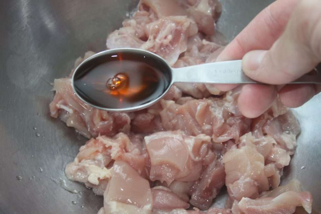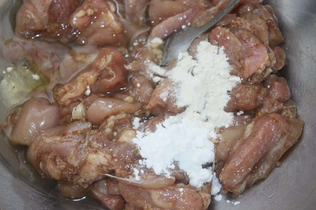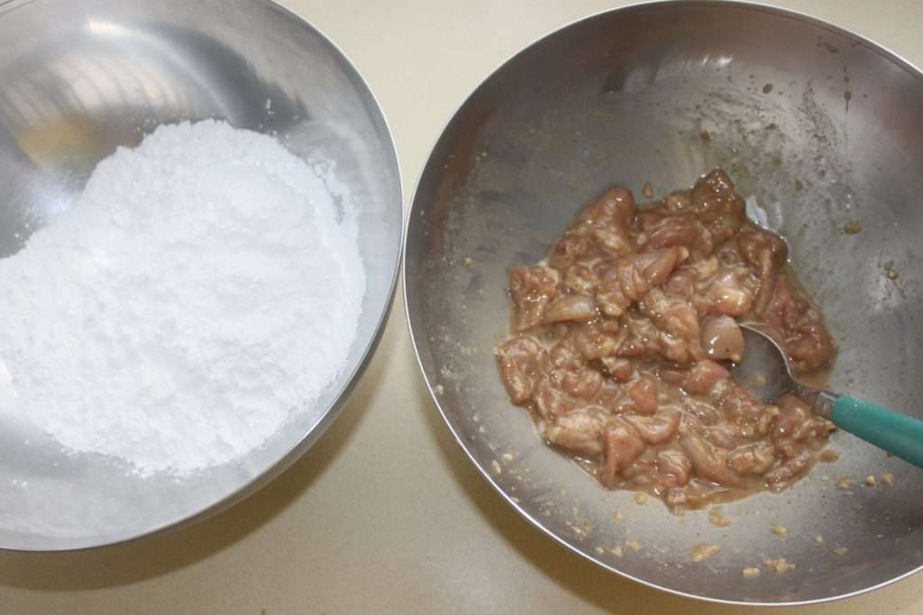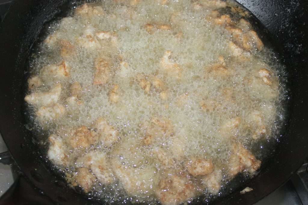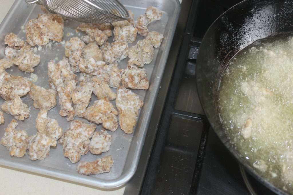 Calentar el aceite a 180°C. Verter el pollo trozo a trozo, retirando ligeramente el exceso de almidón.