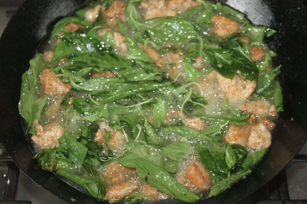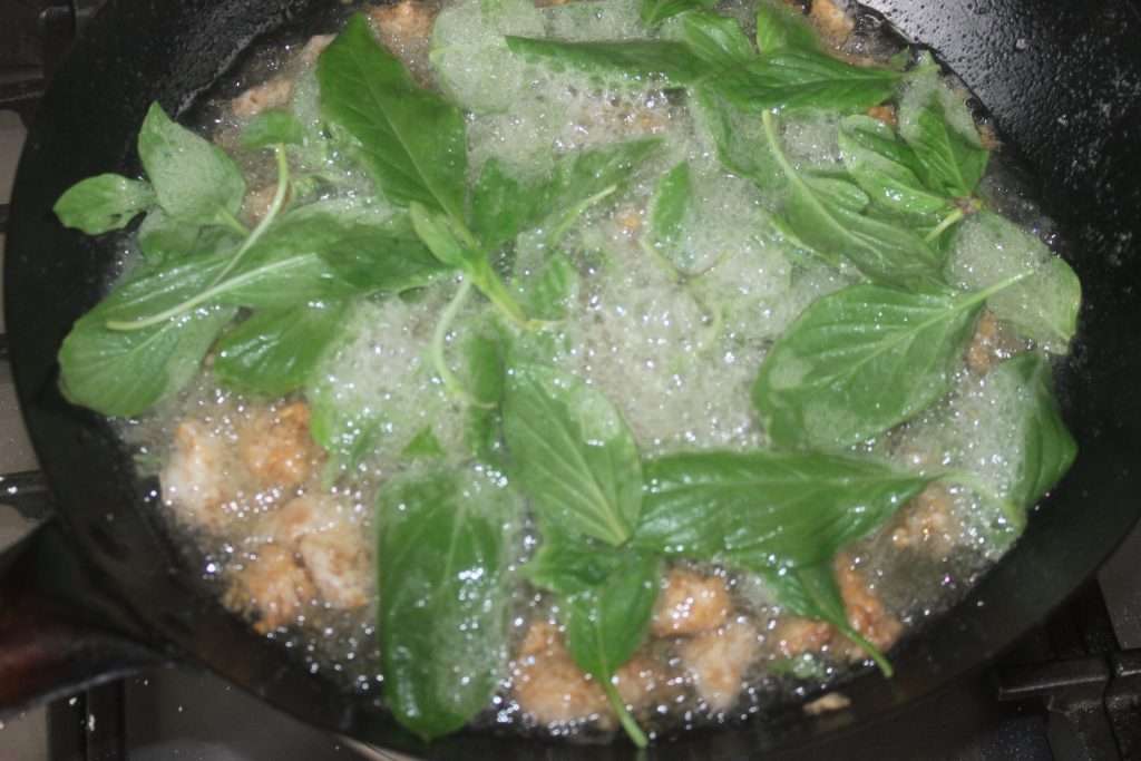 Cuando esté, añada las hojas de albahaca tailandesa.