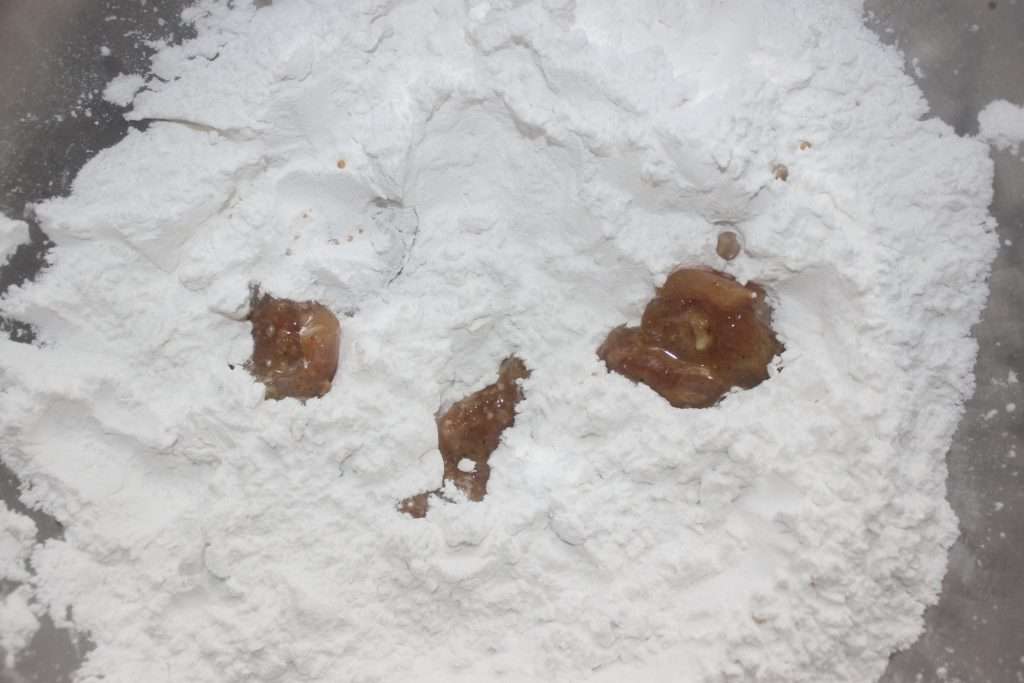- Recouvrez immédiatement de fécule pour bien enrober. Faites de même pour tout le poulet. Laissez-le dans la fécule 20 minutes.
