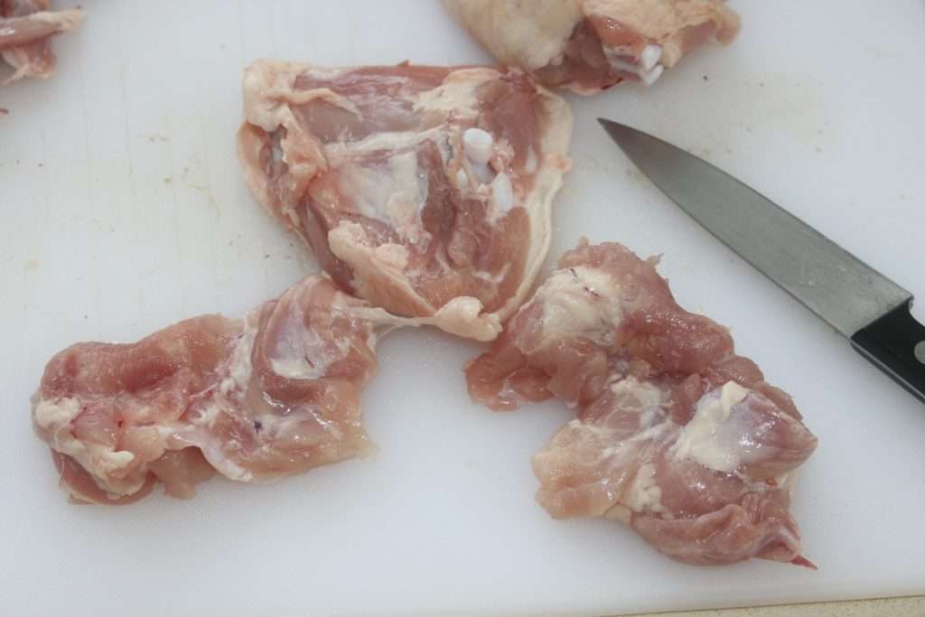 - Préparez les hauts de cuisses. Vous devez avoir 400g de chair au total. Coupez la viande en petits morceaux.